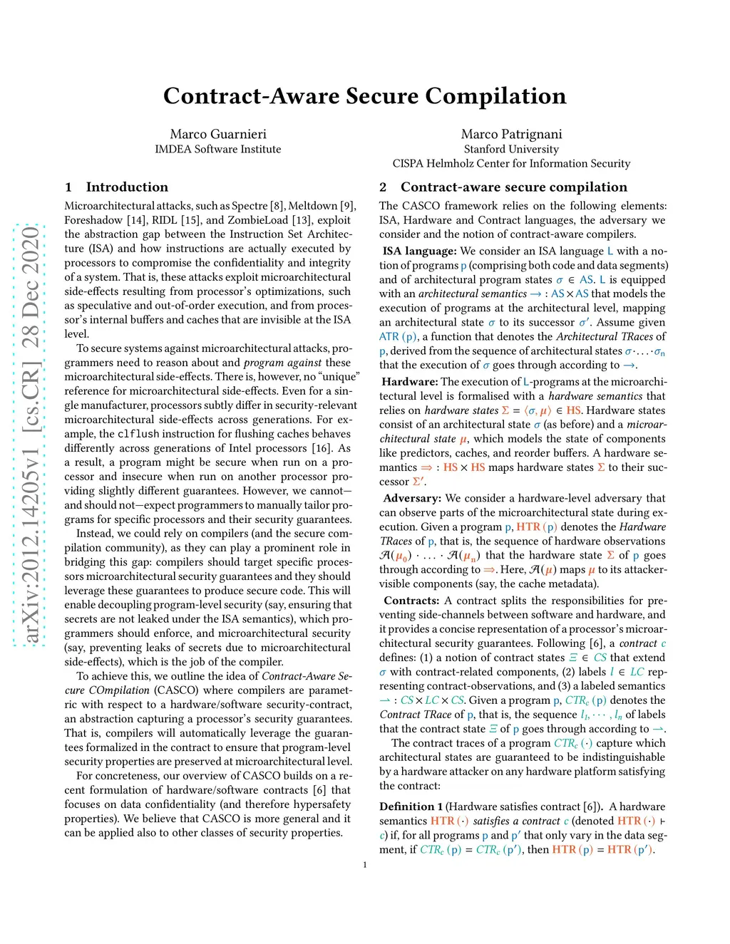 Microarchitectural attacks exploit the abstraction gap between the Instruction Set Architecture (ISA) and how instructions are actually executed by processors to compromise the confidentiality and integrity of a system. To secure systems against microarchitectural attacks, programmers need to reason about and program against these microarchitectural side-effects. However, we cannot -- and should not -- expect programmers to manually tailor programs for specific processors and their security guarantees. Instead, we could rely on compilers (and the secure compilation community), as they can play a prominent role in bridging this gap: compilers should target specific processors microarchitectural security guarantees and they should leverage these guarantees to produce secure code. To achieve this, we outline the idea of Contract-Aware Secure COmpilation (CASCO) where compilers are parametric with respect to a hardware/software security-contract, an abstraction capturing a processor's security guarantees. That is, compilers will automatically leverage the guarantees formalized in the contract to ensure that program-level security properties are preserved at microarchitectural level.
