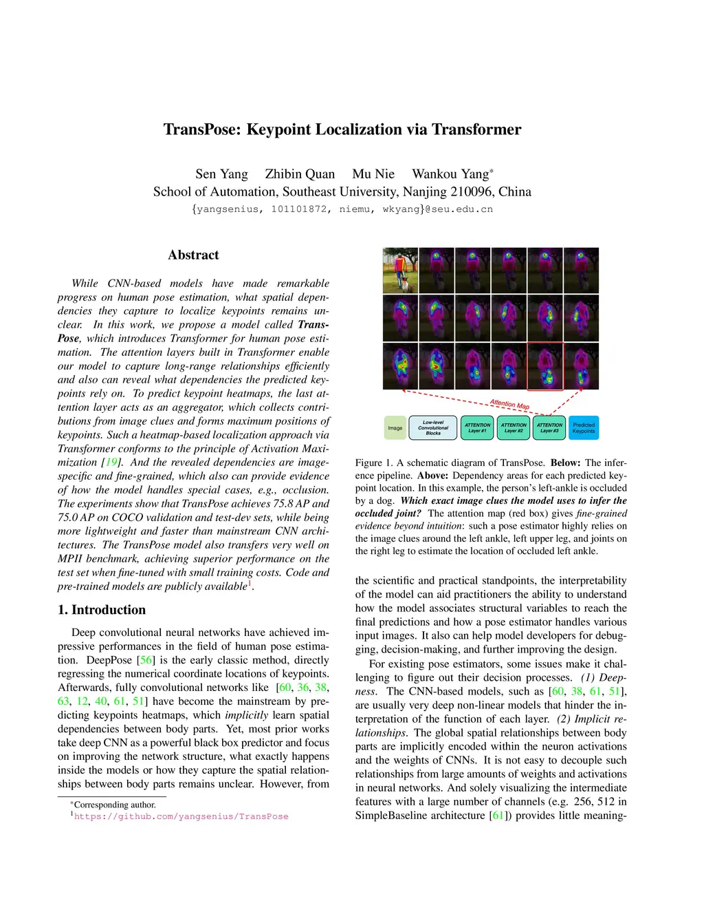 While CNN-based models have made remarkable progress on human pose estimation, what spatial dependencies they capture to localize keypoints remains unclear. In this work, we propose a model called \textbf{TransPose}, which introduces Transformer for human pose estimation. The attention layers built in Transformer enable our model to capture long-range relationships efficiently and also can reveal what dependencies the predicted keypoints rely on. To predict keypoint heatmaps, the last attention layer acts as an aggregator, which collects contributions from image clues and forms maximum positions of keypoints. Such a heatmap-based localization approach via Transformer conforms to the principle of Activation Maximization~\cite{erhan2009visualizing}. And the revealed dependencies are image-specific and fine-grained, which also can provide evidence of how the model handles special cases, e.g., occlusion. The experiments show that TransPose achieves 75.8 AP and 75.0 AP on COCO validation and test-dev sets, while being more lightweight and faster than mainstream CNN architectures. The TransPose model also transfers very well on MPII benchmark, achieving superior performance on the test set when fine-tuned with small training costs. Code and pre-trained models are publicly available\footnote{\url{https://github.com/yangsenius/TransPose}}.