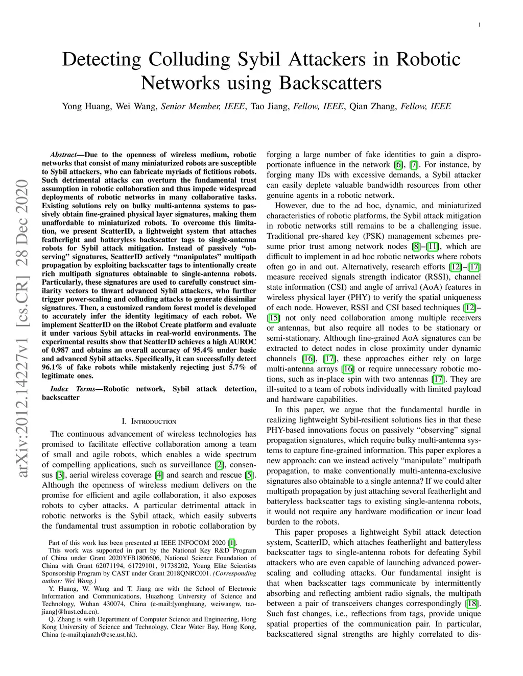 Due to the openness of wireless medium, robotic networks that consist of many miniaturized robots are susceptible to Sybil attackers, who can fabricate myriads of fictitious robots. Such detrimental attacks can overturn the fundamental trust assumption in robotic collaboration and thus impede widespread deployments of robotic networks in many collaborative tasks. Existing solutions rely on bulky multi-antenna systems to passively obtain fine-grained physical layer signatures, making them unaffordable to miniaturized robots. To overcome this limitation, we present ScatterID, a lightweight system that attaches featherlight and batteryless backscatter tags to single-antenna robots for Sybil attack mitigation. Instead of passively "observing" signatures, ScatterID actively "manipulates" multipath propagation by exploiting backscatter tags to intentionally create rich multipath signatures obtainable to single-antenna robots. Particularly, these signatures are used to carefully construct similarity vectors to thwart advanced Sybil attackers, who further trigger power-scaling and colluding attacks to generate dissimilar signatures. Then, a customized random forest model is developed to accurately infer the identity legitimacy of each robot. We implement ScatterID on the iRobot Create platform and evaluate it under various Sybil attacks in real-world environments. The experimental results show that ScatterID achieves a high AUROC of 0.987 and obtains an overall accuracy of 95.4% under basic and advanced Sybil attacks. Specifically, it can successfully detect 96.1% of fake robots while mistakenly rejecting just 5.7% of legitimate ones.