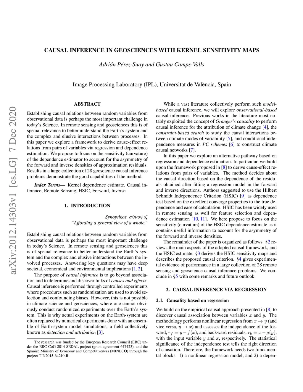 Establishing causal relations between random variables from observational data is perhaps the most important challenge in today's Science. In remote sensing and geosciences this is of special relevance to better understand the Earth's system and the complex and elusive interactions between processes. In this paper we explore a framework to derive cause-effect relations from pairs of variables via regression and dependence estimation. We propose to focus on the sensitivity (curvature) of the dependence estimator to account for the asymmetry of the forward and inverse densities of approximation residuals. Results in a large collection of 28 geoscience causal inference problems demonstrate the good capabilities of the method.
