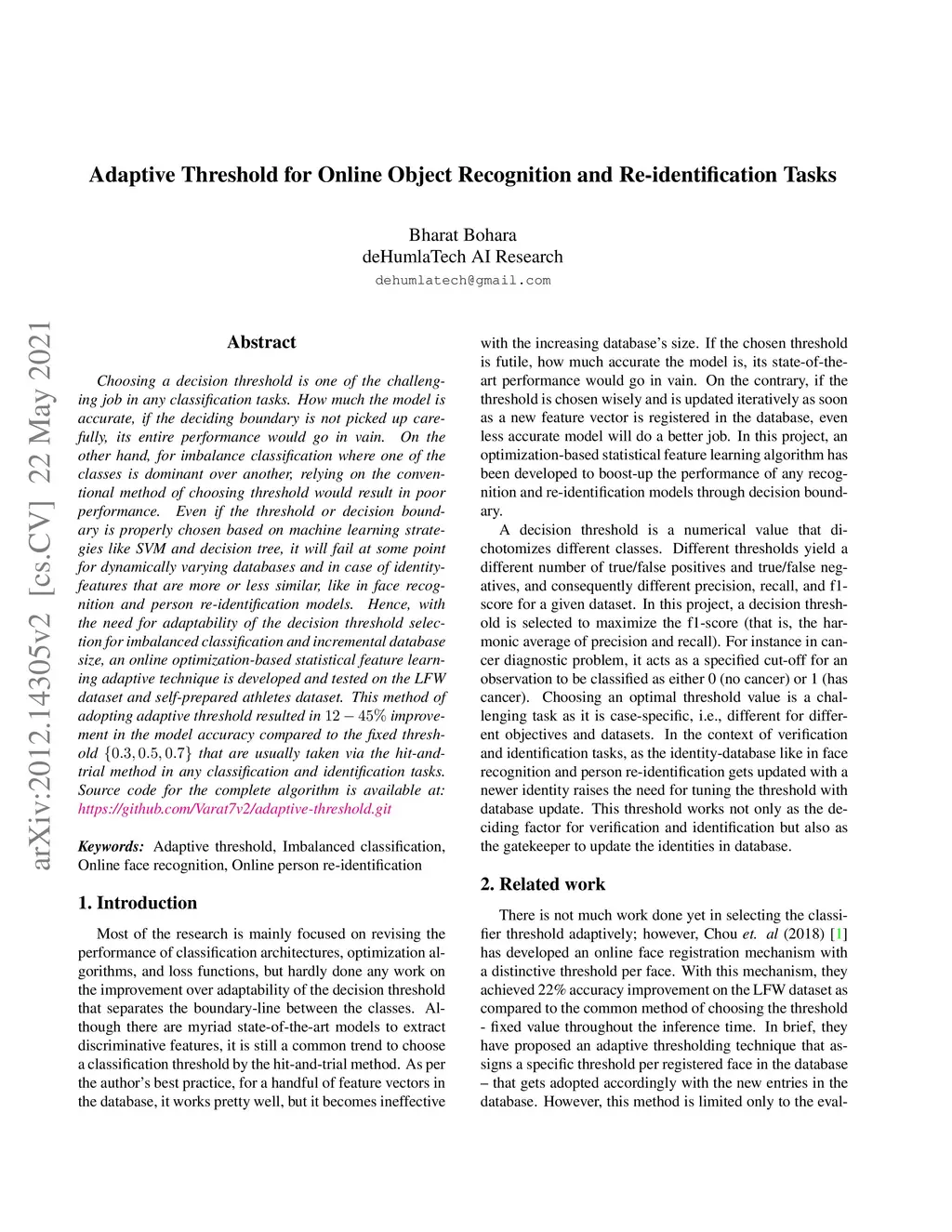 Choosing a decision threshold is one of the challenging job in any classification tasks. How much the model is accurate, if the deciding boundary is not picked up carefully, its entire performance would go in vain. On the other hand, for imbalance classification where one of the classes is dominant over another, relying on the conventional method of choosing threshold would result in poor performance. Even if the threshold or decision boundary is properly chosen based on machine learning strategies like SVM and decision tree, it will fail at some point for dynamically varying databases and in case of identity-features that are more or less similar, like in face recognition and person re-identification models. Hence, with the need for adaptability of the decision threshold selection for imbalanced classification and incremental database size, an online optimization-based statistical feature learning adaptive technique is developed and tested on the LFW datasets and self-prepared athletes datasets. This method of adopting adaptive threshold resulted in 12-45% improvement in the model accuracy compared to the fixed threshold {0.3,0.5,0.7} that are usually taken via the hit-and-trial method in any classification and identification tasks. Source code for the complete algorithm is available at: https://github.com/Varat7v2/adaptive-threshold