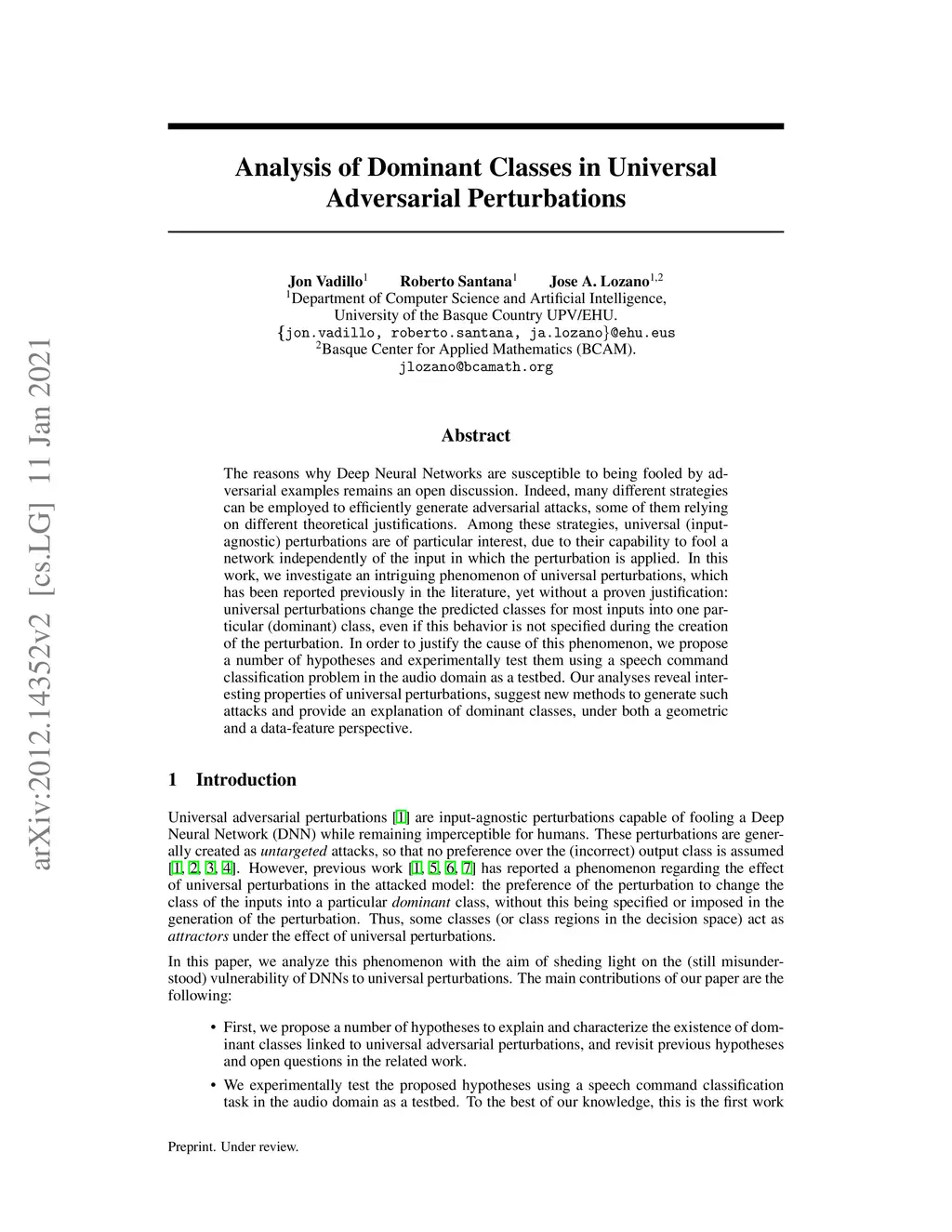 The reasons why Deep Neural Networks are susceptible to being fooled by adversarial examples remains an open discussion. Indeed, many different strategies can be employed to efficiently generate adversarial attacks, some of them relying on different theoretical justifications. Among these strategies, universal (input-agnostic) perturbations are of particular interest, due to their capability to fool a network independently of the input in which the perturbation is applied. In this work, we investigate an intriguing phenomenon of universal perturbations, which has been reported previously in the literature, yet without a proven justification: universal perturbations change the predicted classes for most inputs into one particular (dominant) class, even if this behavior is not specified during the creation of the perturbation. In order to justify the cause of this phenomenon, we propose a number of hypotheses and experimentally test them using a speech command classification problem in the audio domain as a testbed. Our analyses reveal interesting properties of universal perturbations, suggest new methods to generate such attacks and provide an explanation of dominant classes, under both a geometric and a data-feature perspective.