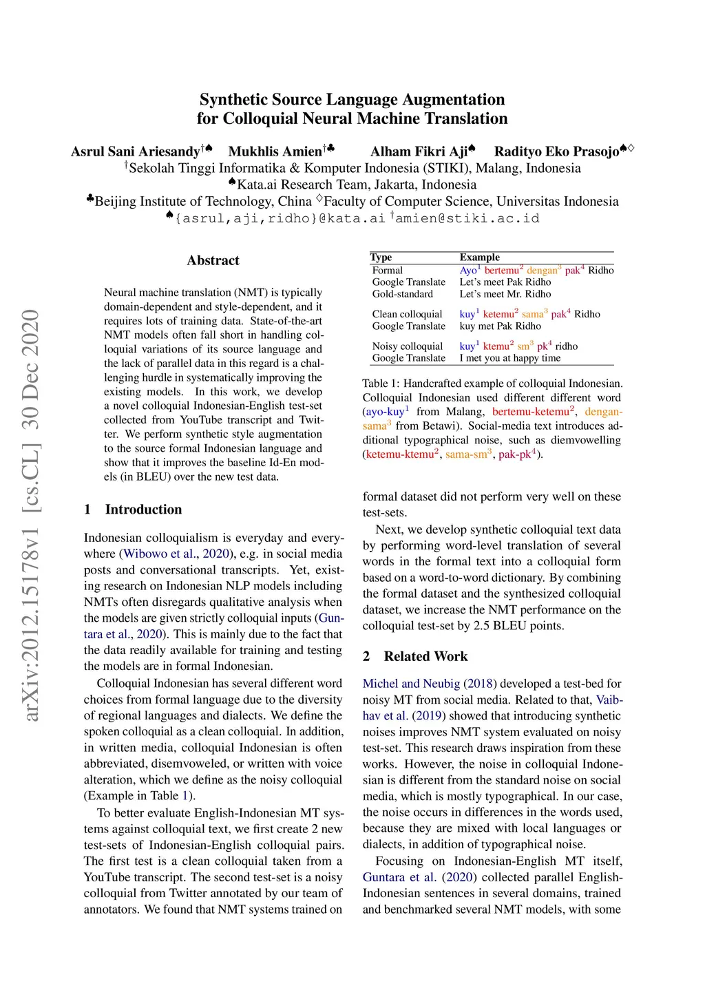Neural machine translation (NMT) is typically domain-dependent and style-dependent, and it requires lots of training data. State-of-the-art NMT models often fall short in handling colloquial variations of its source language and the lack of parallel data in this regard is a challenging hurdle in systematically improving the existing models. In this work, we develop a novel colloquial Indonesian-English test-set collected from YouTube transcript and Twitter. We perform synthetic style augmentation to the source of formal Indonesian language and show that it improves the baseline Id-En models (in BLEU) over the new test data.