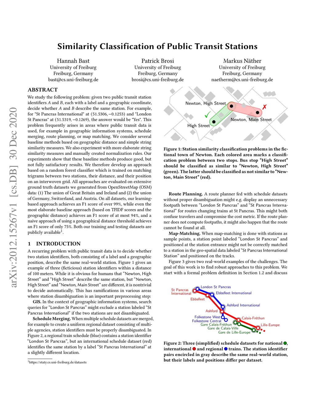We study the following problem: given two public transit station identifiers A and B, each with a label and a geographic coordinate, decide whether A and B describe the same station. For example, for "St Pancras International" at (51.5306, -0.1253) and "London St Pancras" at (51.5319, -0.1269), the answer would be "Yes". This problem frequently arises in areas where public transit data is used, for example in geographic information systems, schedule merging, route planning, or map matching. We consider several baseline methods based on geographic distance and simple string similarity measures. We also experiment with more elaborate string similarity measures and manually created normalization rules. Our experiments show that these baseline methods produce good, but not fully satisfactory results. We therefore develop an approach based on a random forest classifier which is trained on matching trigrams between two stations, their distance, and their position on an interwoven grid. All approaches are evaluated on extensive ground truth datasets we generated from OpenStreetMap (OSM) data: (1) The union of Great Britain and Ireland and (2) the union of Germany, Switzerland, and Austria. On all datasets, our learning-based approach achieves an F1 score of over 99%, while even the most elaborate baseline approach (based on TFIDF scores and the geographic distance) achieves an F1 score of at most 94%, and a naive approach of using a geographical distance threshold achieves an F1 score of only 75%. Both our training and testing datasets are publicly available.
