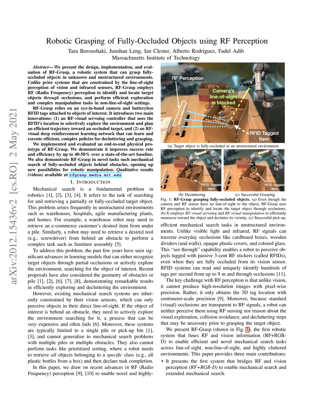 We present the design, implementation, and evaluation of RF-Grasp, a robotic system that can grasp fully-occluded objects in unknown and unstructured environments. Unlike prior systems that are constrained by the line-of-sight perception of vision and infrared sensors, RF-Grasp employs RF (Radio Frequency) perception to identify and locate target objects through occlusions, and perform efficient exploration and complex manipulation tasks in non-line-of-sight settings. RF-Grasp relies on an eye-in-hand camera and batteryless RFID tags attached to objects of interest. It introduces two main innovations: (1) an RF-visual servoing controller that uses the RFID's location to selectively explore the environment and plan an efficient trajectory toward an occluded target, and (2) an RF-visual deep reinforcement learning network that can learn and execute efficient, complex policies for decluttering and grasping. We implemented and evaluated an end-to-end physical prototype of RF-Grasp. We demonstrate it improves success rate and efficiency by up to 40-50% over a state-of-the-art baseline. We also demonstrate RF-Grasp in novel tasks such mechanical search of fully-occluded objects behind obstacles, opening up new possibilities for robotic manipulation. Qualitative results (videos) available at rfgrasp.media.mit.edu