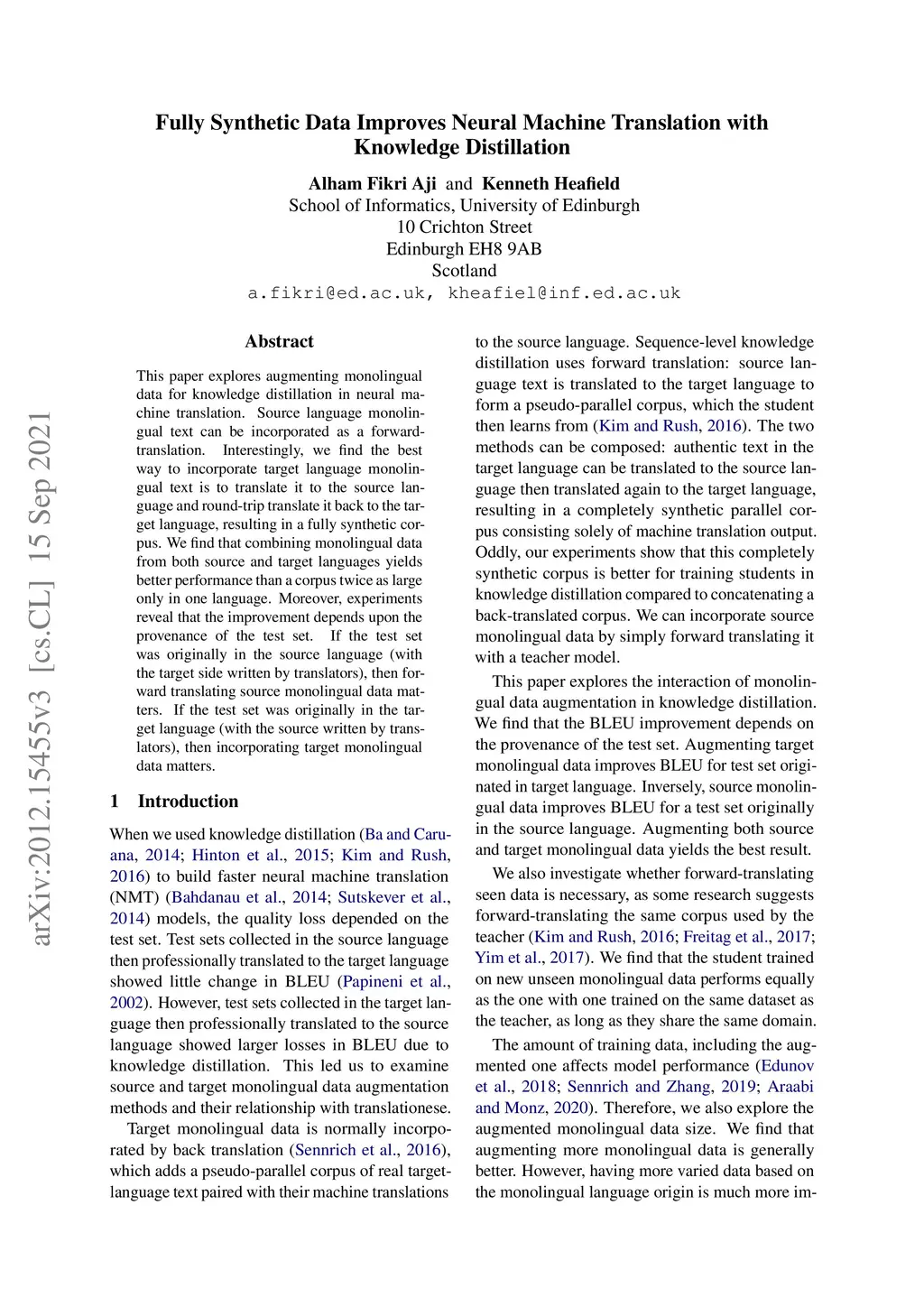 This paper explores augmenting monolingual data for knowledge distillation in neural machine translation. Source language monolingual text can be incorporated as a forward translation. Interestingly, we find the best way to incorporate target language monolingual text is to translate it to the source language and round-trip translate it back to the target language, resulting in a fully synthetic corpus. We find that combining monolingual data from both source and target languages yields better performance than a corpus twice as large only in one language. Moreover, experiments reveal that the improvement depends upon the provenance of the test set. If the test set was originally in the source language (with the target side written by translators), then forward translating source monolingual data matters. If the test set was originally in the target language (with the source written by translators), then incorporating target monolingual data matters.