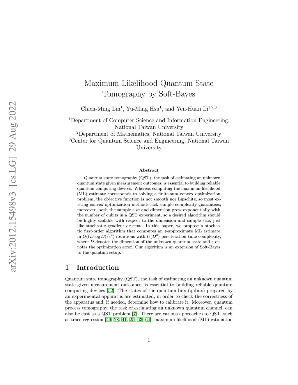 Quantum state tomography (QST), the task of estimating an unknown quantum state given measurement outcomes, is essential to building reliable quantum computing devices. Whereas computing the maximum-likelihood (ML) estimate corresponds to solving a finite-sum convex optimization problem, the objective function is not smooth nor Lipschitz, so most existing convex optimization methods lack sample complexity guarantees; moreover, both the sample size and dimension grow exponentially with the number of qubits in a QST experiment, so a desired algorithm should be highly scalable with respect to the dimension and sample size, just like stochastic gradient descent. In this paper, we propose a stochastic first-order algorithm that computes an -approximate ML estimate in iterations with per-iteration time complexity, where denotes the dimension of the unknown quantum state and denotes the optimization error. Our algorithm is an extension of Soft-Bayes to the quantum setup.