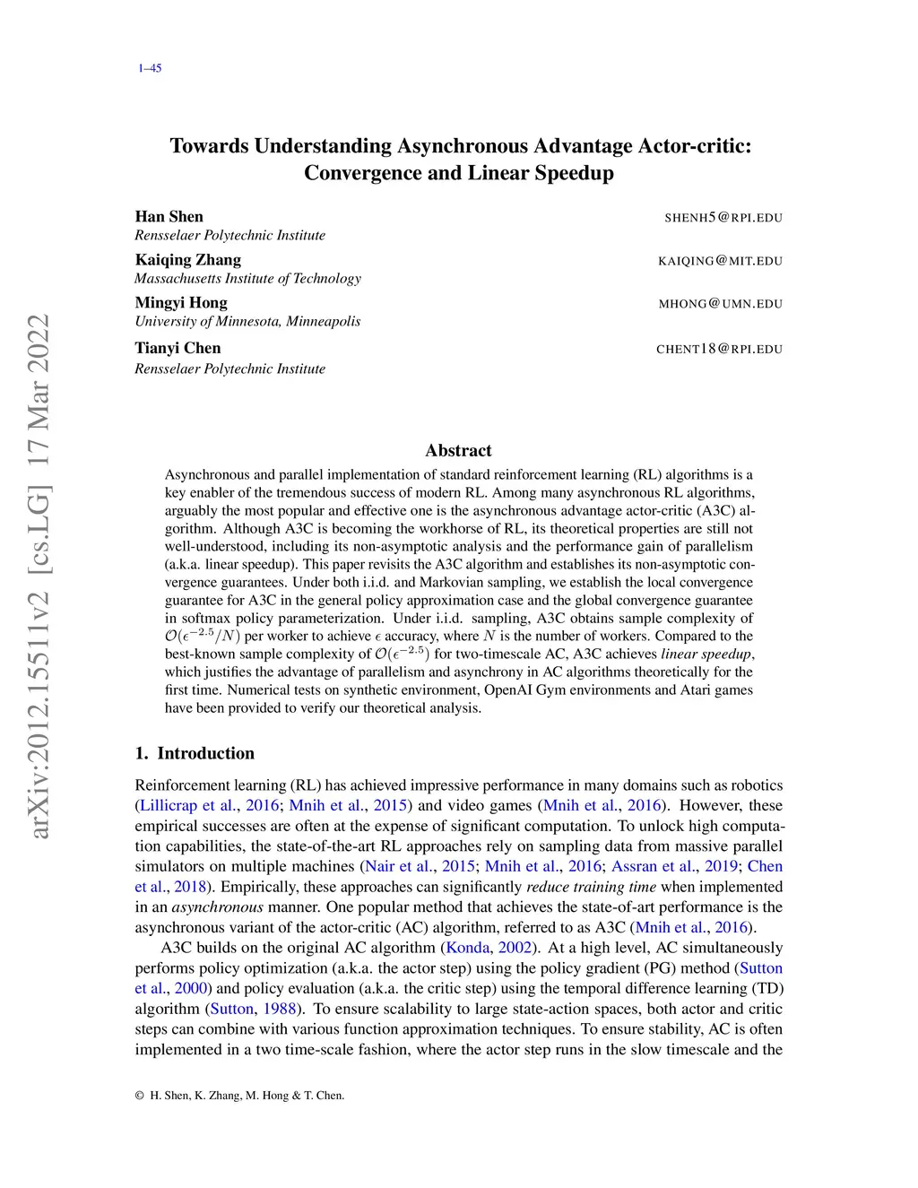Asynchronous and parallel implementation of standard reinforcement learning (RL) algorithms is a key enabler of the tremendous success of modern RL. Among many asynchronous RL algorithms, arguably the most popular and effective one is the asynchronous advantage actor-critic (A3C) algorithm. Although A3C is becoming the workhorse of RL, its theoretical properties are still not well-understood, including its non-asymptotic analysis and the performance gain of parallelism (a.k.a. linear speedup). This paper revisits the A3C algorithm and establishes its non-asymptotic convergence guarantees. Under both i.i.d. and Markovian sampling, we establish the local convergence guarantee for A3C in the general policy approximation case and the global convergence guarantee in softmax policy parameterization. Under i.i.d. sampling, A3C obtains sample complexity of per worker to achieve accuracy, where is the number of workers. Compared to the best-known sample complexity of for two-timescale AC, A3C achieves \emph{linear speedup}, which justifies the advantage of parallelism and asynchrony in AC algorithms theoretically for the first time. Numerical tests on synthetic environment, OpenAI Gym environments and Atari games have been provided to verify our theoretical analysis.