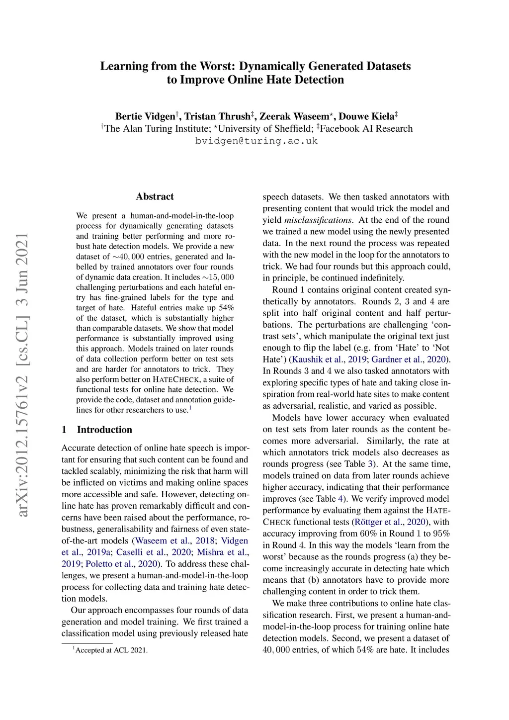 We present a human-and-model-in-the-loop process for dynamically generating datasets and training better performing and more robust hate detection models. We provide a new dataset of ~40,000 entries, generated and labelled by trained annotators over four rounds of dynamic data creation. It includes ~15,000 challenging perturbations and each hateful entry has fine-grained labels for the type and target of hate. Hateful entries make up 54% of the dataset, which is substantially higher than comparable datasets. We show that model performance is substantially improved using this approach. Models trained on later rounds of data collection perform better on test sets and are harder for annotators to trick. They also perform better on HateCheck, a suite of functional tests for online hate detection. We provide the code, dataset and annotation guidelines for other researchers to use. Accepted at ACL 2021.