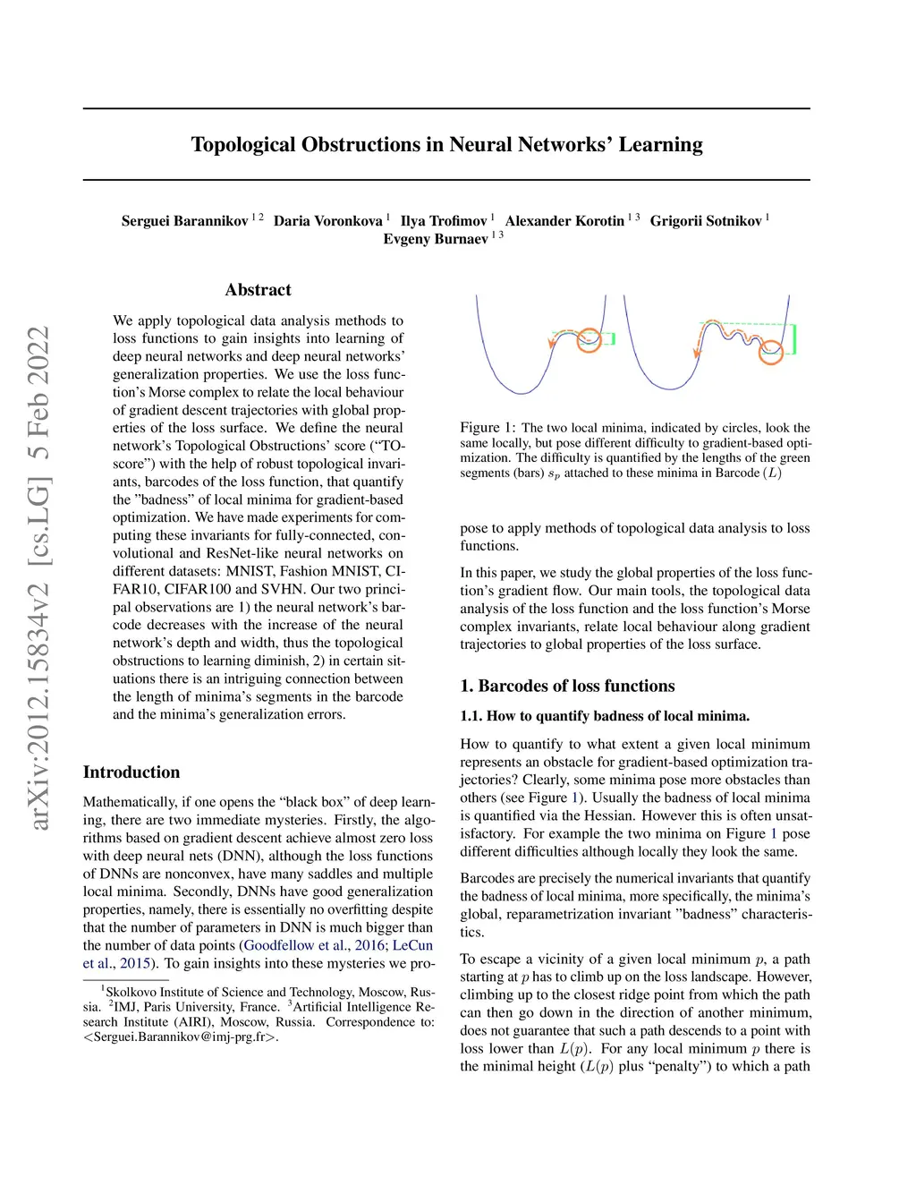 Neural network training is commonly based on SGD. However, the understanding of SGD's ability to converge to good local minima, given the non-convex nature of loss functions and the intricate geometric characteristics of loss landscapes, remains limited. In this paper, we apply topological data analysis methods to loss landscapes to gain insights into the learning process and generalization properties of deep neural networks. We use the loss function topology to relate the local behavior of gradient descent trajectories with the global properties of the loss surface. For this purpose, we define the neural network's Topological Obstructions score ("TO-score") with the help of robust topological invariants, barcodes of the loss function, which quantify the escapability of local minima for gradient-based optimization. Our two principal observations are: 1) the loss barcode of the neural network decreases with increasing depth and width, therefore the topological obstructions to learning diminish; 2) in certain situations there is a connection between the length of minima segments in the loss barcode and the minima's generalization errors. Our statements are based on extensive experiments with fully connected, convolutional, and transformer architectures and several datasets including MNIST, FMNIST, CIFAR10, CIFAR100, SVHN, and multilingual OSCAR text dataset.