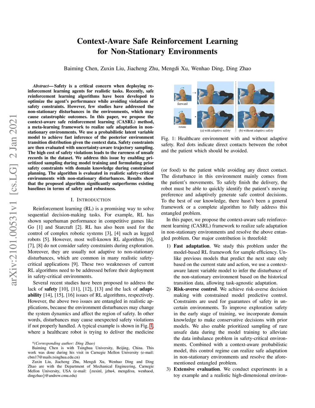 Safety is a critical concern when deploying reinforcement learning agents for realistic tasks. Recently, safe reinforcement learning algorithms have been developed to optimize the agent's performance while avoiding violations of safety constraints. However, few studies have addressed the non-stationary disturbances in the environments, which may cause catastrophic outcomes. In this paper, we propose the context-aware safe reinforcement learning (CASRL) method, a meta-learning framework to realize safe adaptation in non-stationary environments. We use a probabilistic latent variable model to achieve fast inference of the posterior environment transition distribution given the context data. Safety constraints are then evaluated with uncertainty-aware trajectory sampling. The high cost of safety violations leads to the rareness of unsafe records in the dataset. We address this issue by enabling prioritized sampling during model training and formulating prior safety constraints with domain knowledge during constrained planning. The algorithm is evaluated in realistic safety-critical environments with non-stationary disturbances. Results show that the proposed algorithm significantly outperforms existing baselines in terms of safety and robustness.