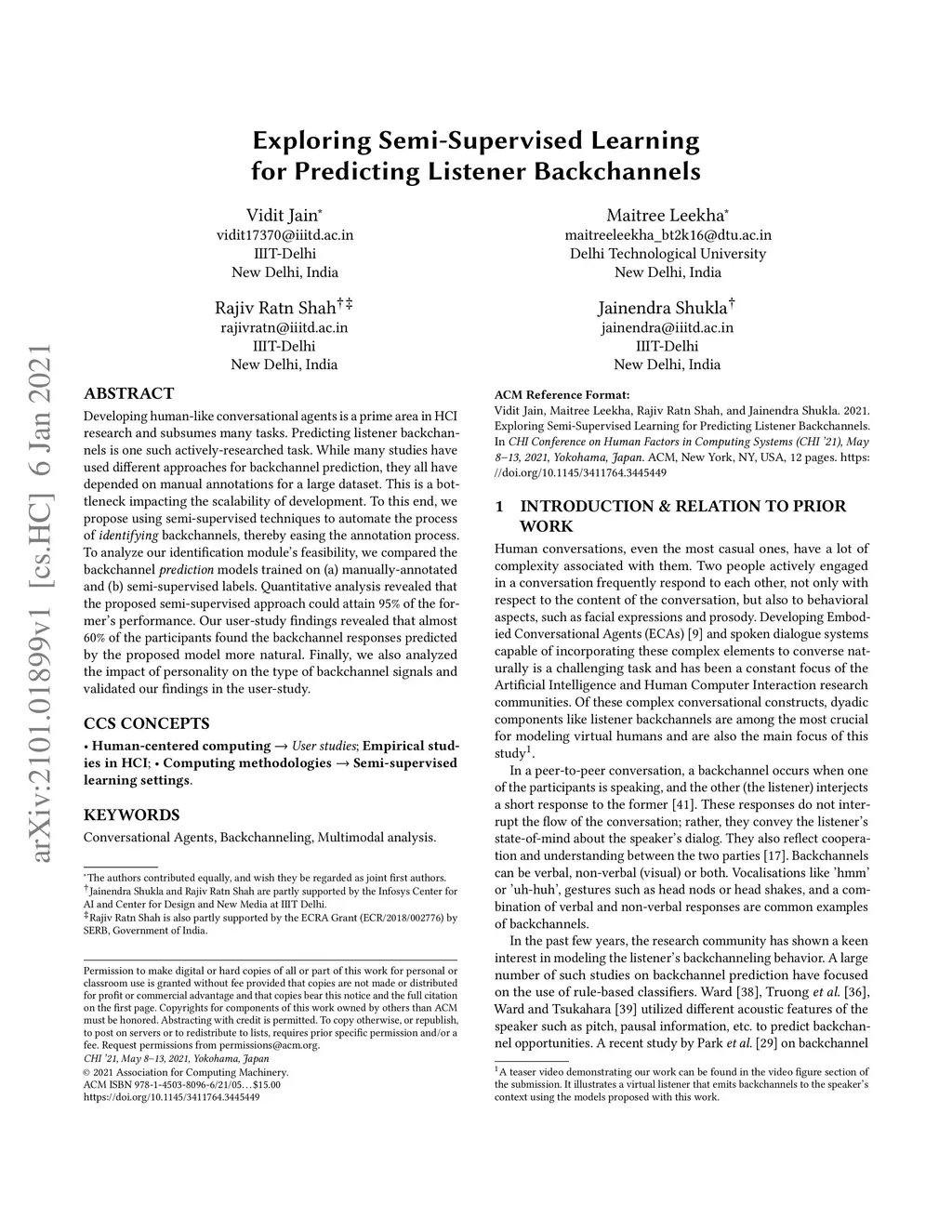 Developing human-like conversational agents is a prime area in HCI research and subsumes many tasks. Predicting listener backchannels is one such actively-researched task. While many studies have used different approaches for backchannel prediction, they all have depended on manual annotations for a large dataset. This is a bottleneck impacting the scalability of development. To this end, we propose using semi-supervised techniques to automate the process of identifying backchannels, thereby easing the annotation process. To analyze our identification module's feasibility, we compared the backchannel prediction models trained on (a) manually-annotated and (b) semi-supervised labels. Quantitative analysis revealed that the proposed semi-supervised approach could attain 95% of the former's performance. Our user-study findings revealed that almost 60% of the participants found the backchannel responses predicted by the proposed model more natural. Finally, we also analyzed the impact of personality on the type of backchannel signals and validated our findings in the user-study.