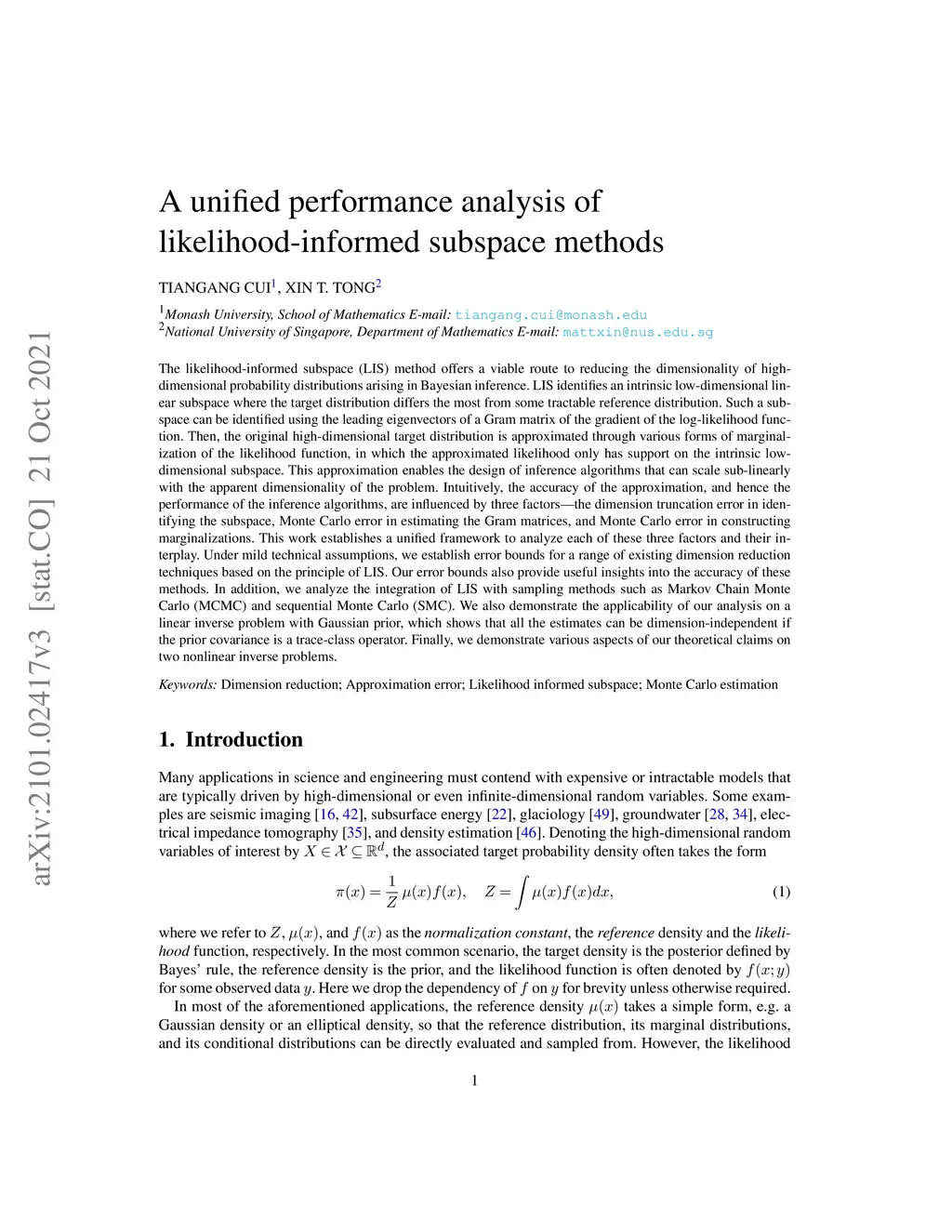 The likelihood-informed subspace (LIS) method offers a viable route to reducing the dimensionality of high-dimensional probability distributions arising in Bayesian inference. LIS identifies an intrinsic low-dimensional linear subspace where the target distribution differs the most from some tractable reference distribution. Such a subspace can be identified using the leading eigenvectors of a Gram matrix of the gradient of the log-likelihood function. Then, the original high-dimensional target distribution is approximated through various forms of marginalization of the likelihood function, in which the approximated likelihood only has support on the intrinsic low-dimensional subspace. This approximation enables the design of inference algorithms that can scale sub-linearly with the apparent dimensionality of the problem. Intuitively, the accuracy of the approximation, and hence the performance of the inference algorithms, are influenced by three factors -- the dimension truncation error in identifying the subspace, Monte Carlo error in estimating the Gram matrices, and Monte Carlo error in constructing marginalizations. %This work establishes a unified framework to analyze each of these three factors and their interplay. Under mild technical assumptions, we establish error bounds for a range of existing dimension reduction techniques based on the principle of LIS. Our error bounds also provide useful insights into the accuracy of these methods. In addition, we analyze the integration of LIS with sampling methods such as Markov Chain Monte Carlo (MCMC) and sequential Monte Carlo (SMC). We also demonstrate the applicability of our analysis on a linear inverse problem with Gaussian prior, which shows that all the estimates can be dimension-independent if the prior covariance is a trace-class operator.
