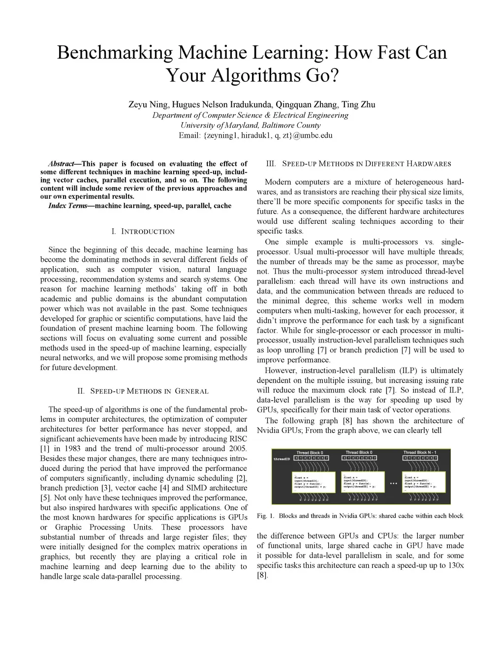 This paper is focused on evaluating the effect of some different techniques in machine learning speed-up, including vector caches, parallel execution, and so on. The following content will include some review of the previous approaches and our own experimental results.