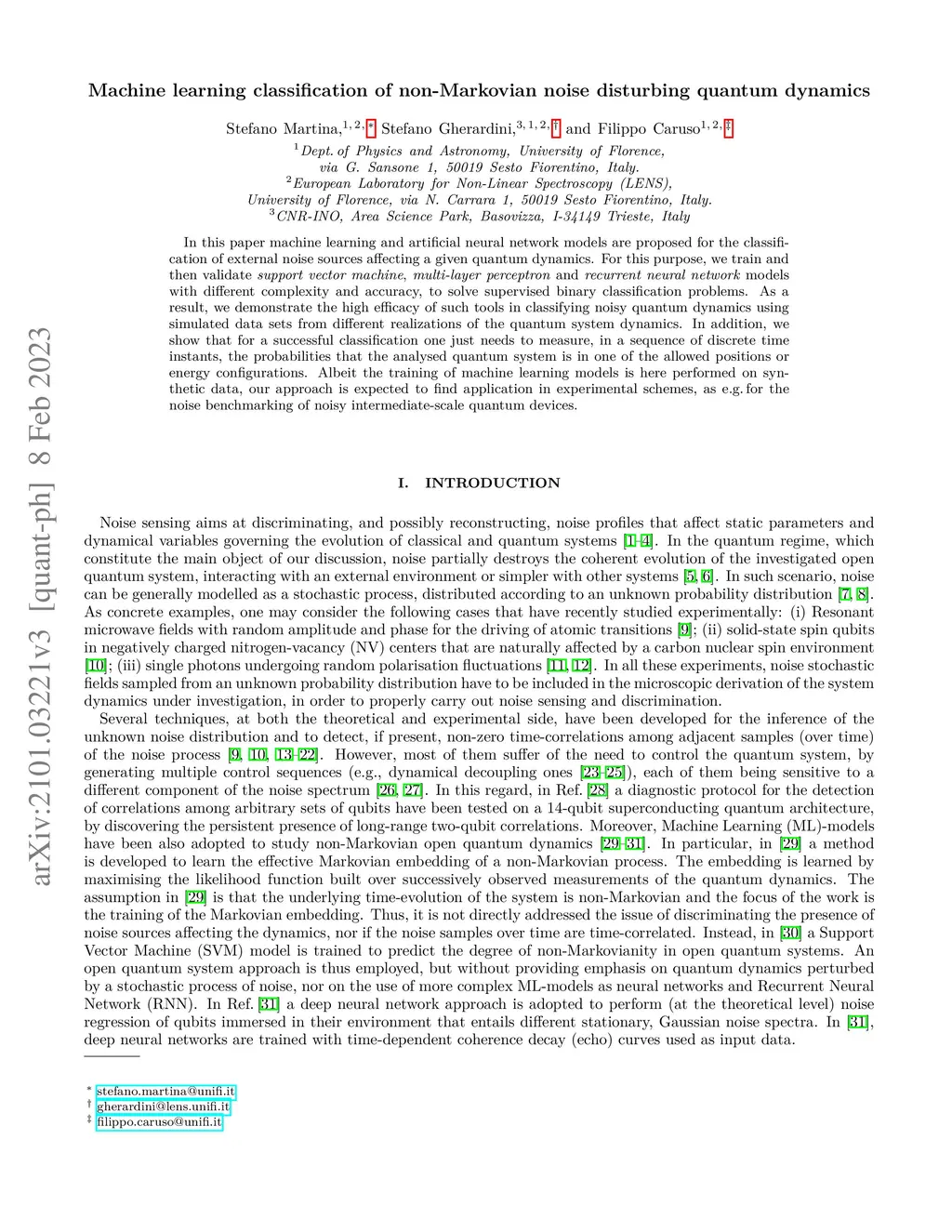 In this paper machine learning and artificial neural network models are proposed for the classification of external noise sources affecting a given quantum dynamics. For this purpose, we train and then validate support vector machine, multi-layer perceptron and recurrent neural network models with different complexity and accuracy, to solve supervised binary classification problems. As a result, we demonstrate the high efficacy of such tools in classifying noisy quantum dynamics using simulated data sets from different realizations of the quantum system dynamics. In addition, we show that for a successful classification one just needs to measure, in a sequence of discrete time instants, the probabilities that the analysed quantum system is in one of the allowed positions or energy configurations. Albeit the training of machine learning models is here performed on synthetic data, our approach is expected to find application in experimental schemes, as e.g. for the noise benchmarking of noisy intermediate-scale quantum devices.