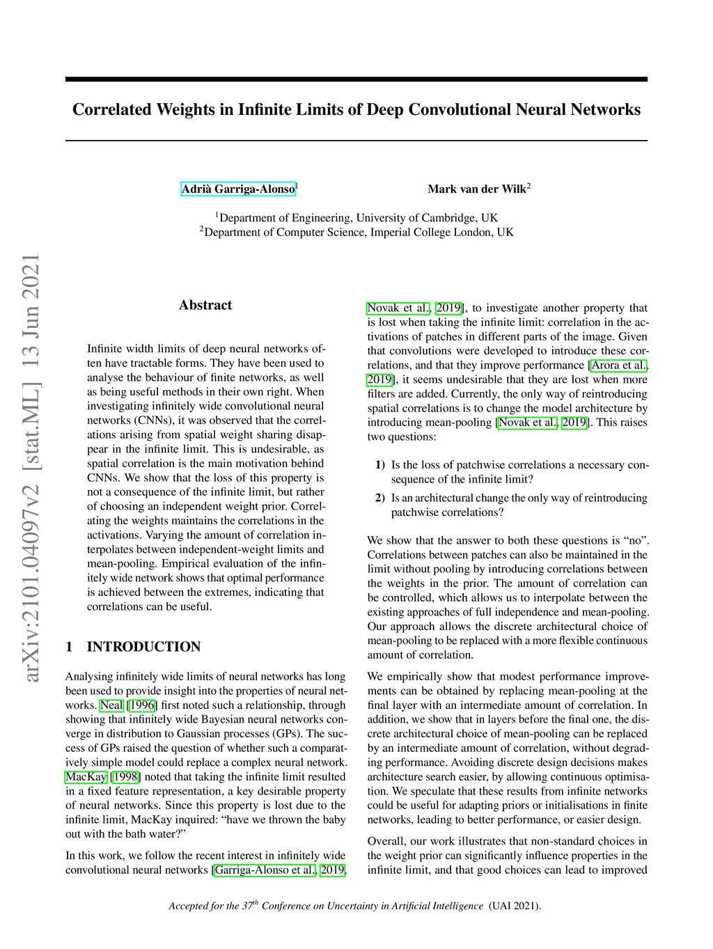 Infinite width limits of deep neural networks often have tractable forms. They have been used to analyse the behaviour of finite networks, as well as being useful methods in their own right. When investigating infinitely wide convolutional neural networks (CNNs), it was observed that the correlations arising from spatial weight sharing disappear in the infinite limit. This is undesirable, as spatial correlation is the main motivation behind CNNs. We show that the loss of this property is not a consequence of the infinite limit, but rather of choosing an independent weight prior. Correlating the weights maintains the correlations in the activations. Varying the amount of correlation interpolates between independent-weight limits and mean-pooling. Empirical evaluation of the infinitely wide network shows that optimal performance is achieved between the extremes, indicating that correlations can be useful.