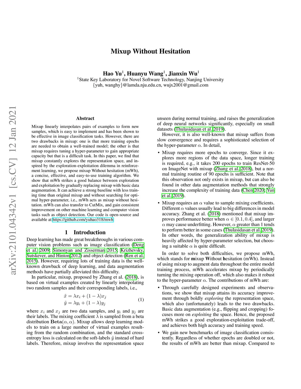 Mixup linearly interpolates pairs of examples to form new samples, which is easy to implement and has been shown to be effective in image classification tasks. However, there are two drawbacks in mixup: one is that more training epochs are needed to obtain a well-trained model; the other is that mixup requires tuning a hyper-parameter to gain appropriate capacity but that is a difficult task. In this paper, we find that mixup constantly explores the representation space, and inspired by the exploration-exploitation dilemma in reinforcement learning, we propose mixup Without hesitation (mWh), a concise, effective, and easy-to-use training algorithm. We show that mWh strikes a good balance between exploration and exploitation by gradually replacing mixup with basic data augmentation. It can achieve a strong baseline with less training time than original mixup and without searching for optimal hyper-parameter, i.e., mWh acts as mixup without hesitation. mWh can also transfer to CutMix, and gain consistent improvement on other machine learning and computer vision tasks such as object detection. Our code is open-source and available at https://github.com/yuhao318/mwh