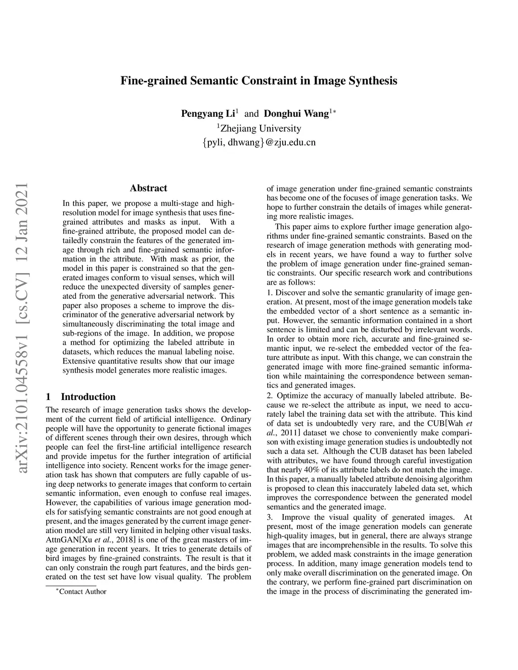 In this paper, we propose a multi-stage and high-resolution model for image synthesis that uses fine-grained attributes and masks as input. With a fine-grained attribute, the proposed model can detailedly constrain the features of the generated image through rich and fine-grained semantic information in the attribute. With mask as prior, the model in this paper is constrained so that the generated images conform to visual senses, which will reduce the unexpected diversity of samples generated from the generative adversarial network. This paper also proposes a scheme to improve the discriminator of the generative adversarial network by simultaneously discriminating the total image and sub-regions of the image. In addition, we propose a method for optimizing the labeled attribute in datasets, which reduces the manual labeling noise. Extensive quantitative results show that our image synthesis model generates more realistic images.