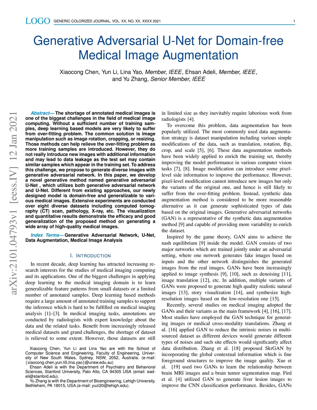 The shortage of annotated medical images is one of the biggest challenges in the field of medical image computing. Without a sufficient number of training samples, deep learning based models are very likely to suffer from over-fitting problem. The common solution is image manipulation such as image rotation, cropping, or resizing. Those methods can help relieve the over-fitting problem as more training samples are introduced. However, they do not really introduce new images with additional information and may lead to data leakage as the test set may contain similar samples which appear in the training set. To address this challenge, we propose to generate diverse images with generative adversarial network. In this paper, we develop a novel generative method named generative adversarial U-Net , which utilizes both generative adversarial network and U-Net. Different from existing approaches, our newly designed model is domain-free and generalizable to various medical images. Extensive experiments are conducted over eight diverse datasets including computed tomography (CT) scan, pathology, X-ray, etc. The visualization and quantitative results demonstrate the efficacy and good generalization of the proposed method on generating a wide array of high-quality medical images.