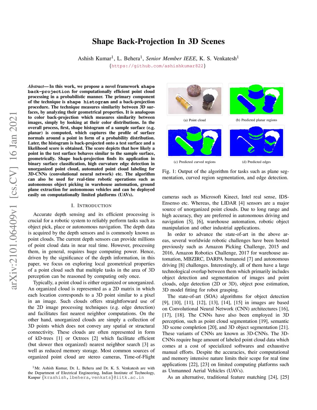 In this work, we propose a novel framework shape back-projection for computationally efficient point cloud processing in a probabilistic manner. The primary component of the technique is shape histogram and a back-projection procedure. The technique measures similarity between 3D surfaces, by analyzing their geometrical properties. It is analogous to color back-projection which measures similarity between images, simply by looking at their color distributions. In the overall process, first, shape histogram of a sample surface (e.g. planar) is computed, which captures the profile of surface normals around a point in form of a probability distribution. Later, the histogram is back-projected onto a test surface and a likelihood score is obtained. The score depicts that how likely a point in the test surface behaves similar to the sample surface, geometrically. Shape back-projection finds its application in binary surface classification, high curvature edge detection in unorganized point cloud, automated point cloud labeling for 3D-CNNs (convolutional neural network) etc. The algorithm can also be used for real-time robotic operations such as autonomous object picking in warehouse automation, ground plane extraction for autonomous vehicles and can be deployed easily on computationally limited platforms (UAVs).