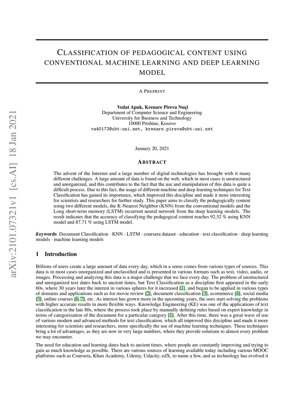 The advent of the Internet and a large number of digital technologies has brought with it many different challenges. A large amount of data is found on the web, which in most cases is unstructured and unorganized, and this contributes to the fact that the use and manipulation of this data is quite a difficult process. Due to this fact, the usage of different machine and deep learning techniques for Text Classification has gained its importance, which improved this discipline and made it more interesting for scientists and researchers for further study. This paper aims to classify the pedagogical content using two different models, the K-Nearest Neighbor (KNN) from the conventional models and the Long short-term memory (LSTM) recurrent neural network from the deep learning models. The result indicates that the accuracy of classifying the pedagogical content reaches 92.52 % using KNN model and 87.71 % using LSTM model.
