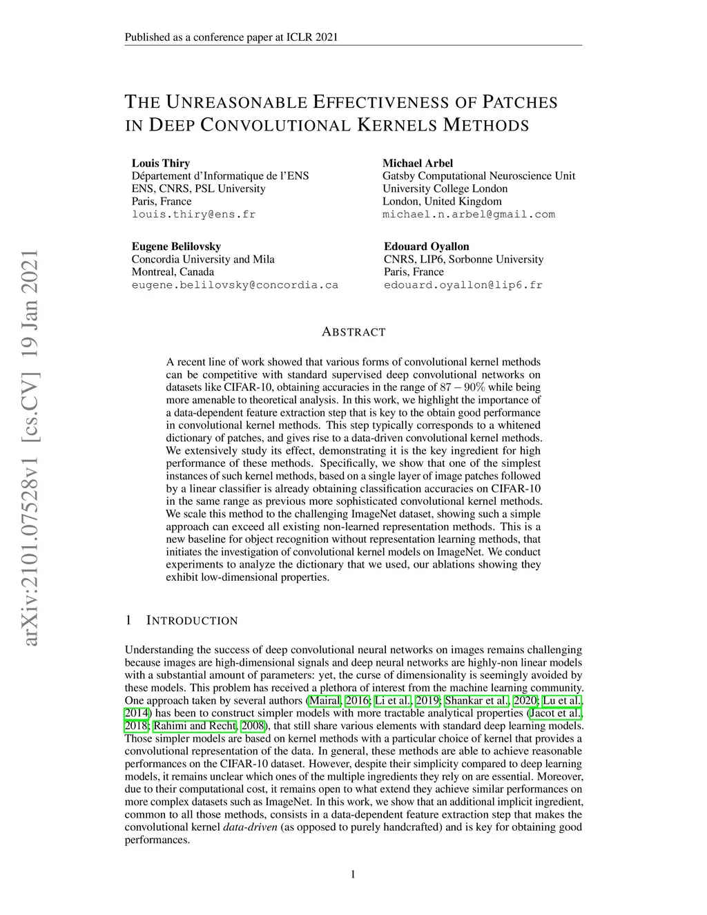 A recent line of work showed that various forms of convolutional kernel methods can be competitive with standard supervised deep convolutional networks on datasets like CIFAR-10, obtaining accuracies in the range of 87-90% while being more amenable to theoretical analysis. In this work, we highlight the importance of a data-dependent feature extraction step that is key to the obtain good performance in convolutional kernel methods. This step typically corresponds to a whitened dictionary of patches, and gives rise to a data-driven convolutional kernel methods. We extensively study its effect, demonstrating it is the key ingredient for high performance of these methods. Specifically, we show that one of the simplest instances of such kernel methods, based on a single layer of image patches followed by a linear classifier is already obtaining classification accuracies on CIFAR-10 in the same range as previous more sophisticated convolutional kernel methods. We scale this method to the challenging ImageNet dataset, showing such a simple approach can exceed all existing non-learned representation methods. This is a new baseline for object recognition without representation learning methods, that initiates the investigation of convolutional kernel models on ImageNet. We conduct experiments to analyze the dictionary that we used, our ablations showing they exhibit low-dimensional properties.