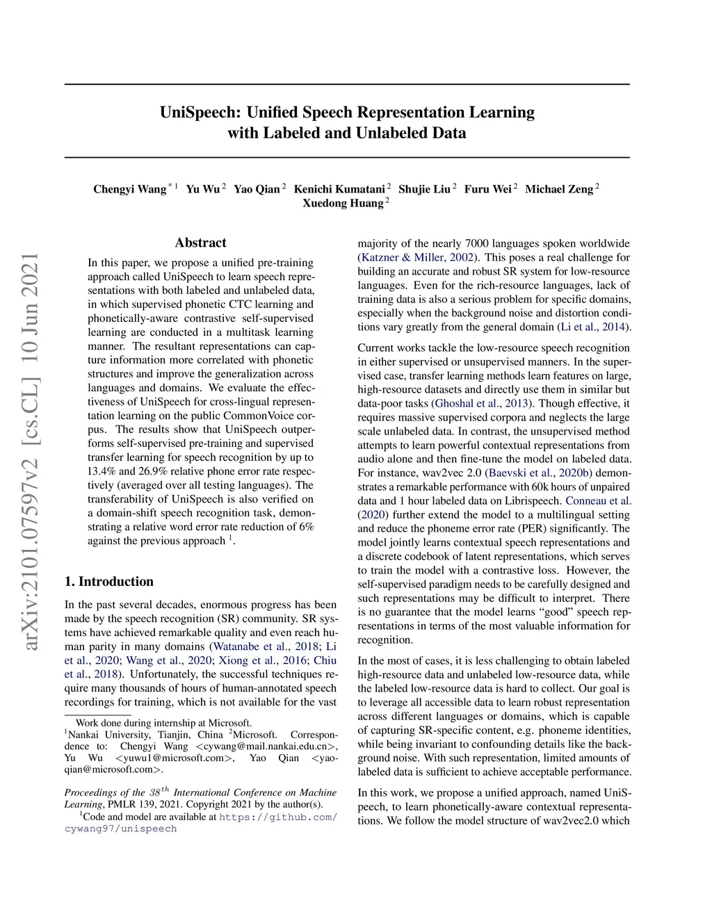 UniSpeech: Unified Speech Representation Learning with Labeled and