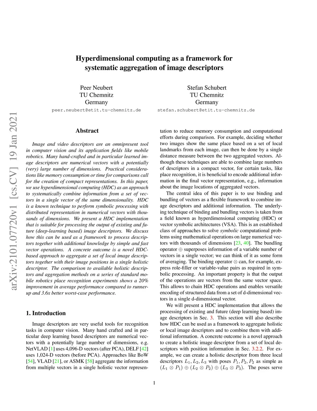 Image and video descriptors are an omnipresent tool in computer vision and its application fields like mobile robotics. Many hand-crafted and in particular learned image descriptors are numerical vectors with a potentially (very) large number of dimensions. Practical considerations like memory consumption or time for comparisons call for the creation of compact representations. In this paper, we use hyperdimensional computing (HDC) as an approach to systematically combine information from a set of vectors in a single vector of the same dimensionality. HDC is a known technique to perform symbolic processing with distributed representation in numerical vectors with thousands of dimensions. We present a HDC implementation that is suitable for processing the output of existing and future (deep-learning based) image descriptors. We discuss how this can be used as a framework to process descriptors together with additional knowledge by simple and fast vector operations. A concrete outcome is a novel HDC-based approach to aggregate a set of local image descriptors together with their image positions in a single holistic descriptor. The comparison to available holistic descriptors and aggregation methods on a series of standard mobile robotics place recognition experiments shows a 20% improvement in average performance compared to runner-up and 3.6x better worst-case performance.