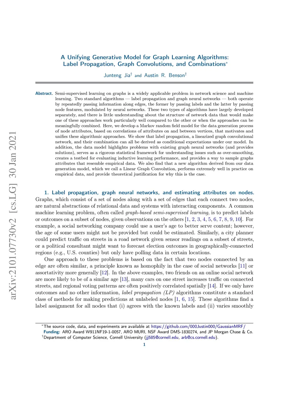 Semi-supervised learning on graphs is a widely applicable problem in network science and machine learning. Two standard algorithms -- label propagation and graph neural networks -- both operate by repeatedly passing information along edges, the former by passing labels and the latter by passing node features, modulated by neural networks. These two types of algorithms have largely developed separately, and there is little understanding about the structure of network data that would make one of these approaches work particularly well compared to the other or when the approaches can be meaningfully combined. Here, we develop a Markov random field model for the data generation process of node attributes, based on correlations of attributes on and between vertices, that motivates and unifies these algorithmic approaches. We show that label propagation, a linearized graph convolutional network, and their combination can all be derived as conditional expectations under our model, when conditioning on different attributes. In addition, the data model highlights deficiencies in existing graph neural networks (while producing new algorithmic solutions), serves as a rigorous statistical framework for understanding graph learning issues such as over-smoothing, creates a testbed for evaluating inductive learning performance, and provides a way to sample graphs attributes that resemble empirical data. We also find that a new algorithm derived from our data generation model, which we call a Linear Graph Convolution, performs extremely well in practice on empirical data, and provide theoretical justification for why this is the case.
