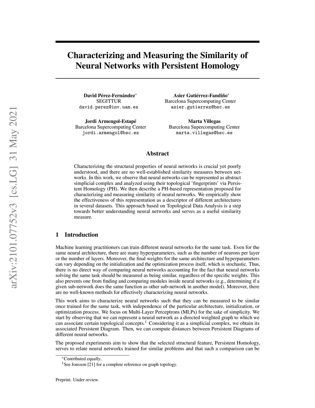 Characterizing the structural properties of neural networks is crucial yet poorly understood, and there are no well-established similarity measures between networks. In this work, we observe that neural networks can be represented as abstract simplicial complex and analyzed using their topological 'fingerprints' via Persistent Homology (PH). We then describe a PH-based representation proposed for characterizing and measuring similarity of neural networks. We empirically show the effectiveness of this representation as a descriptor of different architectures in several datasets. This approach based on Topological Data Analysis is a step towards better understanding neural networks and serves as a useful similarity measure.