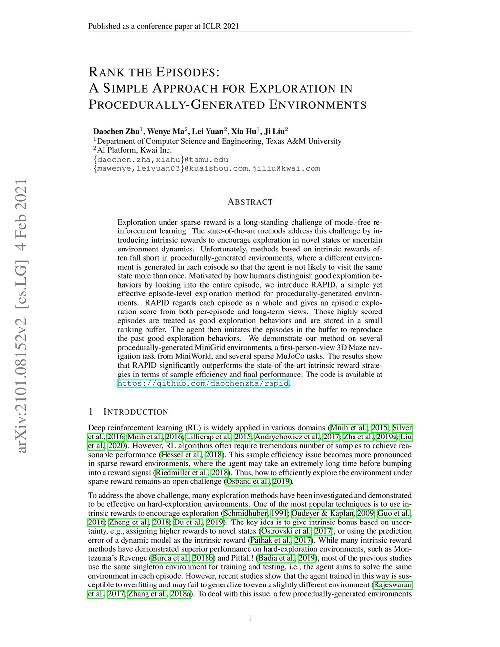 Exploration under sparse reward is a long-standing challenge of model-free reinforcement learning. The state-of-the-art methods address this challenge by introducing intrinsic rewards to encourage exploration in novel states or uncertain environment dynamics. Unfortunately, methods based on intrinsic rewards often fall short in procedurally-generated environments, where a different environment is generated in each episode so that the agent is not likely to visit the same state more than once. Motivated by how humans distinguish good exploration behaviors by looking into the entire episode, we introduce RAPID, a simple yet effective episode-level exploration method for procedurally-generated environments. RAPID regards each episode as a whole and gives an episodic exploration score from both per-episode and long-term views. Those highly scored episodes are treated as good exploration behaviors and are stored in a small ranking buffer. The agent then imitates the episodes in the buffer to reproduce the past good exploration behaviors. We demonstrate our method on several procedurally-generated MiniGrid environments, a first-person-view 3D Maze navigation task from MiniWorld, and several sparse MuJoCo tasks. The results show that RAPID significantly outperforms the state-of-the-art intrinsic reward strategies in terms of sample efficiency and final performance. The code is available at https://github.com/daochenzha/rapid