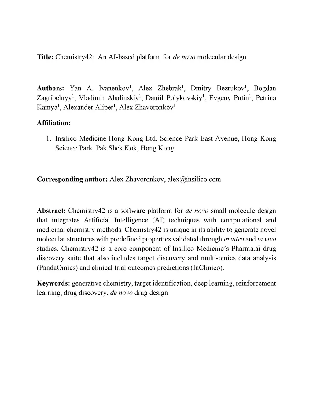 Chemistry42 is a software platform for de novo small molecule design that integrates Artificial Intelligence (AI) techniques with computational and medicinal chemistry methods. Chemistry42 is unique in its ability to generate novel molecular structures with predefined properties validated through in vitro and in vivo studies. Chemistry42 is a core component of Insilico Medicine Pharma.ai drug discovery suite that also includes target discovery and multi-omics data analysis (PandaOmics) and clinical trial outcomes predictions (InClinico).