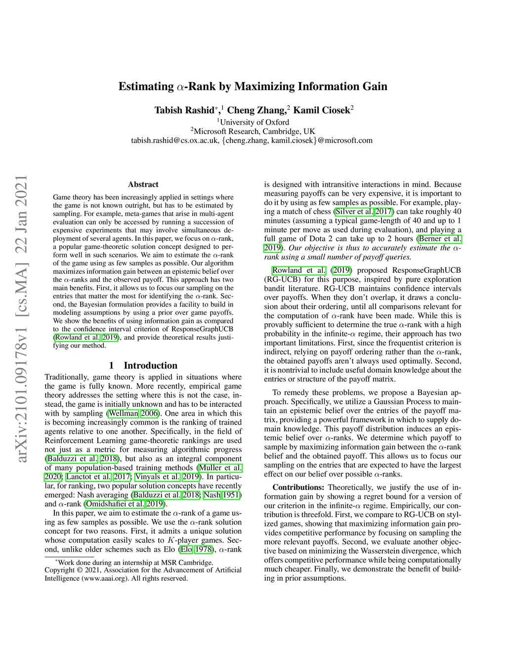 Game theory has been increasingly applied in settings where the game is not known outright, but has to be estimated by sampling. For example, meta-games that arise in multi-agent evaluation can only be accessed by running a succession of expensive experiments that may involve simultaneous deployment of several agents. In this paper, we focus on -rank, a popular game-theoretic solution concept designed to perform well in such scenarios. We aim to estimate the -rank of the game using as few samples as possible. Our algorithm maximizes information gain between an epistemic belief over the -ranks and the observed payoff. This approach has two main benefits. First, it allows us to focus our sampling on the entries that matter the most for identifying the -rank. Second, the Bayesian formulation provides a facility to build in modeling assumptions by using a prior over game payoffs. We show the benefits of using information gain as compared to the confidence interval criterion of ResponseGraphUCB (Rowland et al. 2019), and provide theoretical results justifying our method.