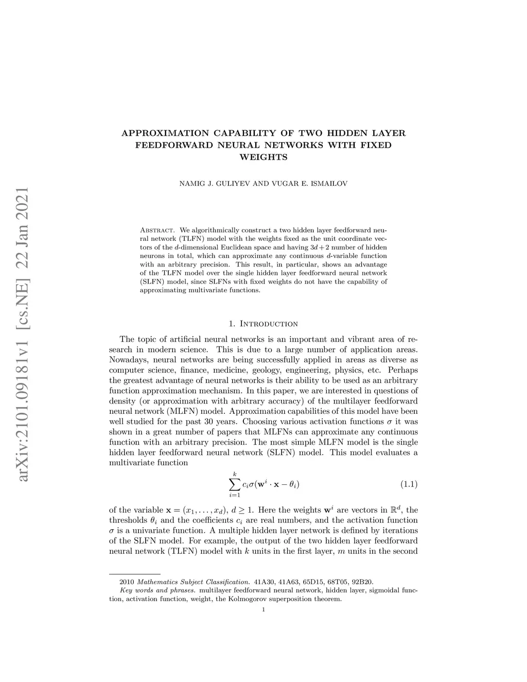 We algorithmically construct a two hidden layer feedforward neural network (TLFN) model with the weights fixed as the unit coordinate vectors of the -dimensional Euclidean space and having number of hidden neurons in total, which can approximate any continuous -variable function with an arbitrary precision. This result, in particular, shows an advantage of the TLFN model over the single hidden layer feedforward neural network (SLFN) model, since SLFNs with fixed weights do not have the capability of approximating multivariate functions.