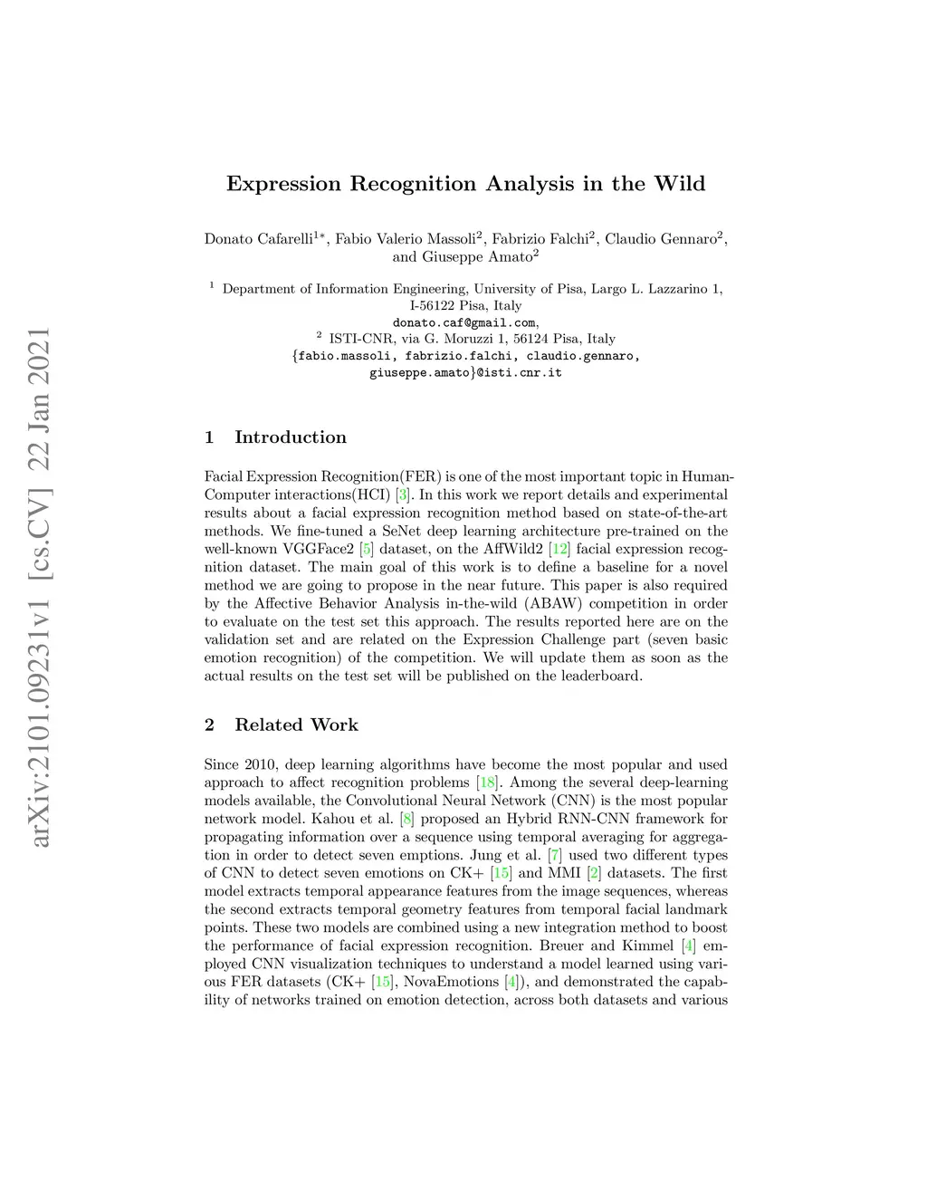 Facial Expression Recognition(FER) is one of the most important topic in Human-Computer interactions(HCI). In this work we report details and experimental results about a facial expression recognition method based on state-of-the-art methods. We fine-tuned a SeNet deep learning architecture pre-trained on the well-known VGGFace2 dataset, on the AffWild2 facial expression recognition dataset. The main goal of this work is to define a baseline for a novel method we are going to propose in the near future. This paper is also required by the Affective Behavior Analysis in-the-wild (ABAW) competition in order to evaluate on the test set this approach. The results reported here are on the validation set and are related on the Expression Challenge part (seven basic emotion recognition) of the competition. We will update them as soon as the actual results on the test set will be published on the leaderboard.