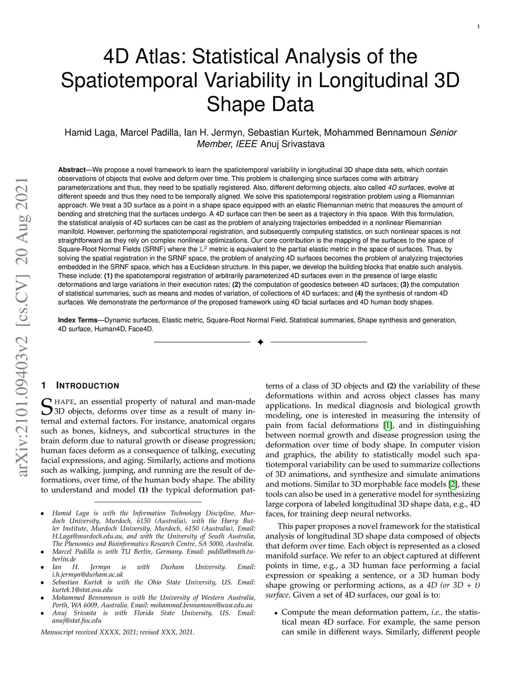 We propose a novel framework to learn the spatiotemporal variability in longitudinal 3D shape data sets, which contain observations of objects that evolve and deform over time. This problem is challenging since surfaces come with arbitrary parameterizations and thus, they need to be spatially registered. Also, different deforming objects, also called 4D surfaces, evolve at different speeds and thus they need to be temporally aligned. We solve this spatiotemporal registration problem using a Riemannian approach. We treat a 3D surface as a point in a shape space equipped with an elastic Riemannian metric that measures the amount of bending and stretching that the surfaces undergo. A 4D surface can then be seen as a trajectory in this space. With this formulation, the statistical analysis of 4D surfaces can be cast as the problem of analyzing trajectories embedded in a nonlinear Riemannian manifold. However, performing the spatiotemporal registration, and subsequently computing statistics, on such nonlinear spaces is not straightforward as they rely on complex nonlinear optimizations. Our core contribution is the mapping of the surfaces to the space of Square-Root Normal Fields where the L2 metric is equivalent to the partial elastic metric in the space of surfaces. Thus, by solving the spatial registration in the SRNF space, the problem of analyzing 4D surfaces becomes the problem of analyzing trajectories embedded in the SRNF space, which has a Euclidean structure. In this paper, we develop the building blocks that enable such analysis. These include: (1) the spatiotemporal registration of arbitrarily parameterized 4D surfaces in the presence of large elastic deformations and large variations in their execution rates; (2) the computation of geodesics between 4D surfaces; (3) the computation of statistical summaries; and (4) the synthesis of random 4D surfaces.