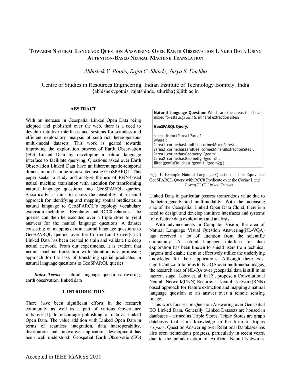 With an increase in Geospatial Linked Open Data being adopted and published over the web, there is a need to develop intuitive interfaces and systems for seamless and efficient exploratory analysis of such rich heterogeneous multi-modal datasets. This work is geared towards improving the exploration process of Earth Observation (EO) Linked Data by developing a natural language interface to facilitate querying. Questions asked over Earth Observation Linked Data have an inherent spatio-temporal dimension and can be represented using GeoSPARQL. This paper seeks to study and analyze the use of RNN-based neural machine translation with attention for transforming natural language questions into GeoSPARQL queries. Specifically, it aims to assess the feasibility of a neural approach for identifying and mapping spatial predicates in natural language to GeoSPARQL's topology vocabulary extension including - Egenhofer and RCC8 relations. The queries can then be executed over a triple store to yield answers for the natural language questions. A dataset consisting of mappings from natural language questions to GeoSPARQL queries over the Corine Land Cover(CLC) Linked Data has been created to train and validate the deep neural network. From our experiments, it is evident that neural machine translation with attention is a promising approach for the task of translating spatial predicates in natural language questions to GeoSPARQL queries.