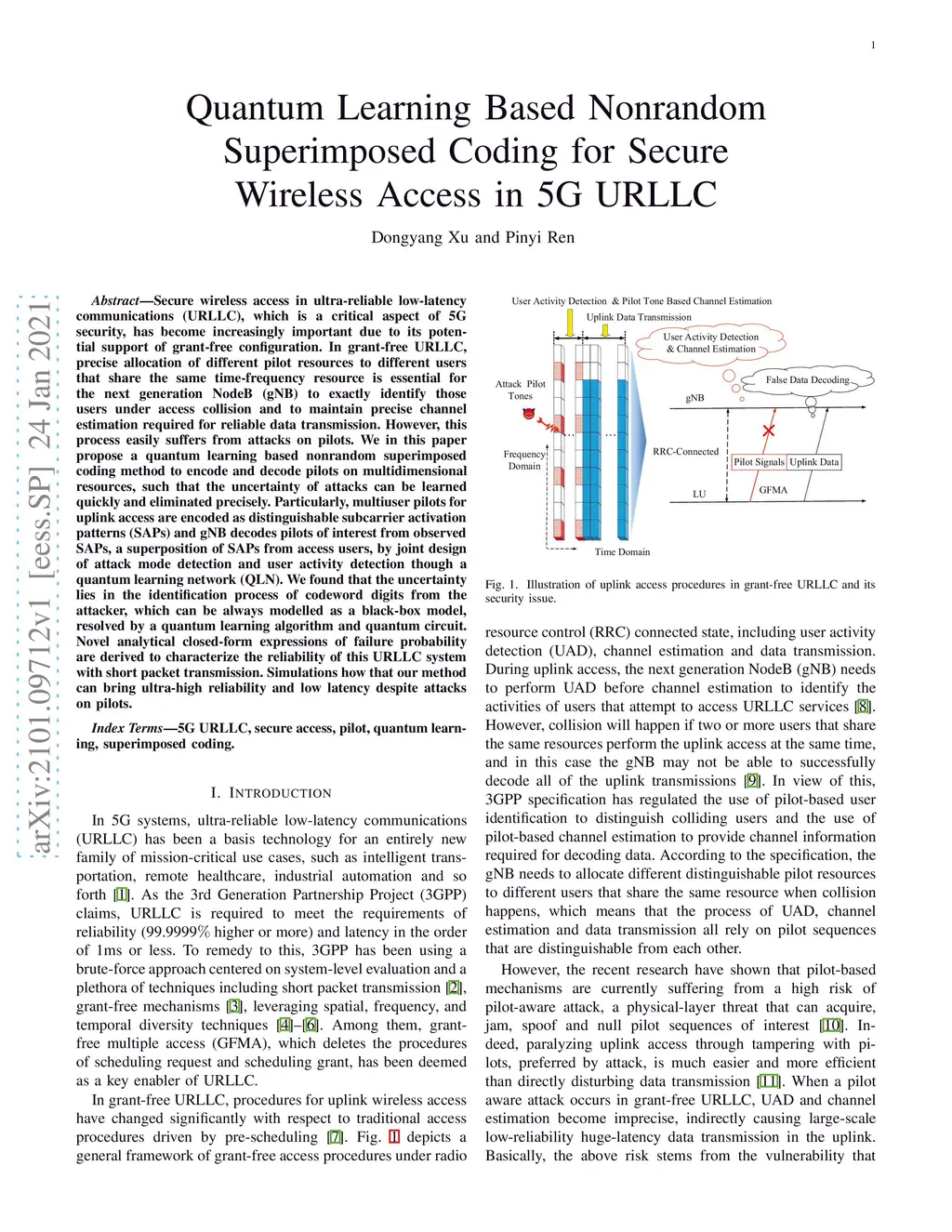 Secure wireless access in ultra-reliable low-latency communications (URLLC), which is a critical aspect of 5G security, has become increasingly important due to its potential support of grant-free configuration. In grant-free URLLC, precise allocation of different pilot resources to different users that share the same time-frequency resource is essential for the next generation NodeB (gNB) to exactly identify those users under access collision and to maintain precise channel estimation required for reliable data transmission. However, this process easily suffers from attacks on pilots. We in this paper propose a quantum learning based nonrandom superimposed coding method to encode and decode pilots on multidimensional resources, such that the uncertainty of attacks can be learned quickly and eliminated precisely. Particularly, multiuser pilots for uplink access are encoded as distinguishable subcarrier activation patterns (SAPs) and gNB decodes pilots of interest from observed SAPs, a superposition of SAPs from access users, by joint design of attack mode detection and user activity detection though a quantum learning network (QLN). We found that the uncertainty lies in the identification process of codeword digits from the attacker, which can be always modelled as a black-box model, resolved by a quantum learning algorithm and quantum circuit. Novel analytical closed-form expressions of failure probability are derived to characterize the reliability of this URLLC system with short packet transmission. Simulations how that our method can bring ultra-high reliability and low latency despite attacks on pilots.
