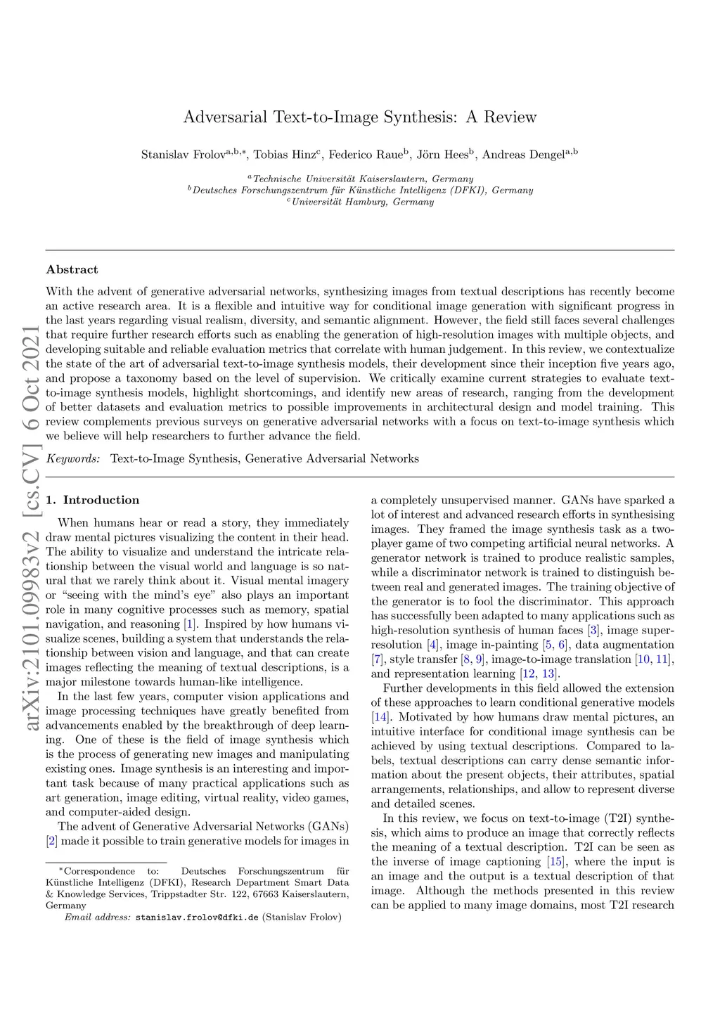 With the advent of generative adversarial networks, synthesizing images from textual descriptions has recently become an active research area. It is a flexible and intuitive way for conditional image generation with significant progress in the last years regarding visual realism, diversity, and semantic alignment. However, the field still faces several challenges that require further research efforts such as enabling the generation of high-resolution images with multiple objects, and developing suitable and reliable evaluation metrics that correlate with human judgement. In this review, we contextualize the state of the art of adversarial text-to-image synthesis models, their development since their inception five years ago, and propose a taxonomy based on the level of supervision. We critically examine current strategies to evaluate text-to-image synthesis models, highlight shortcomings, and identify new areas of research, ranging from the development of better datasets and evaluation metrics to possible improvements in architectural design and model training. This review complements previous surveys on generative adversarial networks with a focus on text-to-image synthesis which we believe will help researchers to further advance the field.