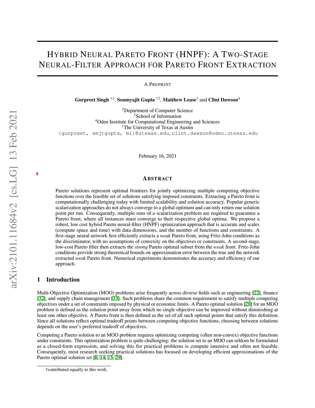 Classification, recommendation, and ranking problems often involve competing goals with additional constraints (e.g., to satisfy fairness or diversity criteria). Such optimization problems are quite challenging, often involving non-convex functions along with considerations of user preferences in balancing trade-offs. Pareto solutions represent optimal frontiers for jointly optimizing multiple competing objectives. A major obstacle for frequently used linear-scalarization strategies is that the resulting optimization problem might not always converge to a global optimum. Furthermore, such methods only return one solution point per run. A Pareto solution set is a subset of all such global optima over multiple runs for different trade-off choices. Therefore, a Pareto front can only be guaranteed with multiple runs of the linear-scalarization problem, where all runs converge to their respective global optima. Consequently, extracting a Pareto front for practical problems is computationally intractable with substantial computational overheads, limited scalability, and reduced accuracy. We propose a robust, low cost, two-stage, hybrid neural Pareto optimization approach that is accurate and scales (compute space and time) with data dimensions, as well as number of functions and constraints. The first stage (neural network) efficiently extracts a weak Pareto front, using Fritz-John conditions as the discriminator, with no assumptions of convexity on the objectives or constraints. The second stage (efficient Pareto filter) extracts the strong Pareto optimal subset given the weak front from stage 1. Fritz-John conditions provide us with theoretical bounds on approximation error between the true and network extracted weak Pareto front. Numerical experiments demonstrates the accuracy and efficiency on a canonical set of benchmark problems and a fairness optimization task from prior works.