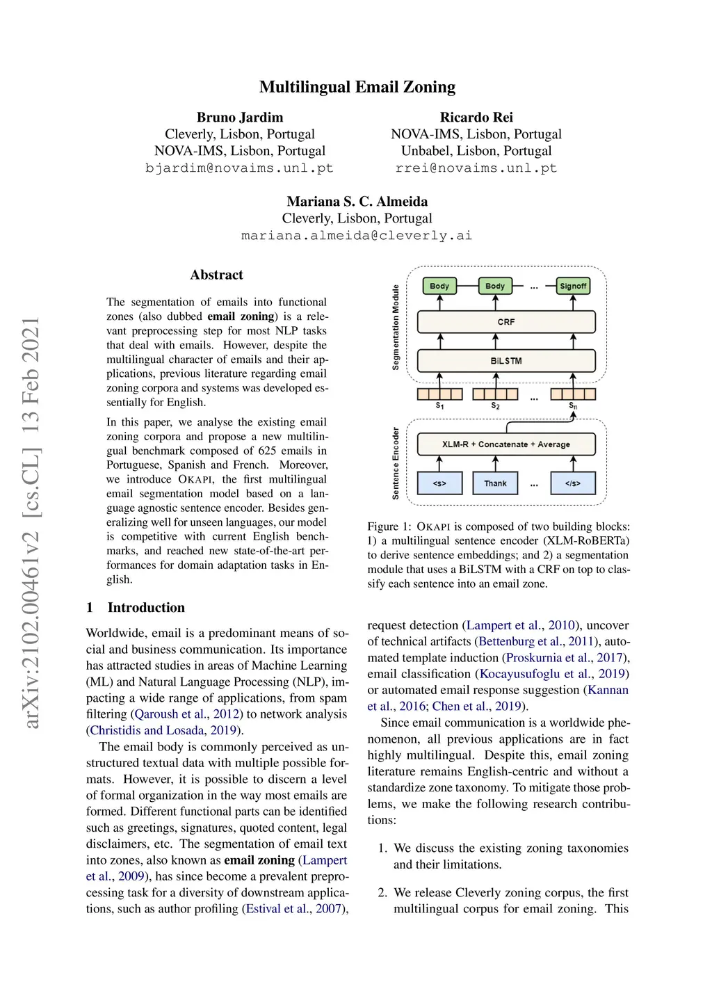 The segmentation of emails into functional zones (also dubbed email zoning) is a relevant preprocessing step for most NLP tasks that deal with emails. However, despite the multilingual character of emails and their applications, previous literature regarding email zoning corpora and systems was developed essentially for English. In this paper, we analyse the existing email zoning corpora and propose a new multilingual benchmark composed of 625 emails in Portuguese, Spanish and French. Moreover, we introduce OKAPI, the first multilingual email segmentation model based on a language agnostic sentence encoder. Besides generalizing well for unseen languages, our model is competitive with current English benchmarks, and reached new state-of-the-art performances for domain adaptation tasks in English.