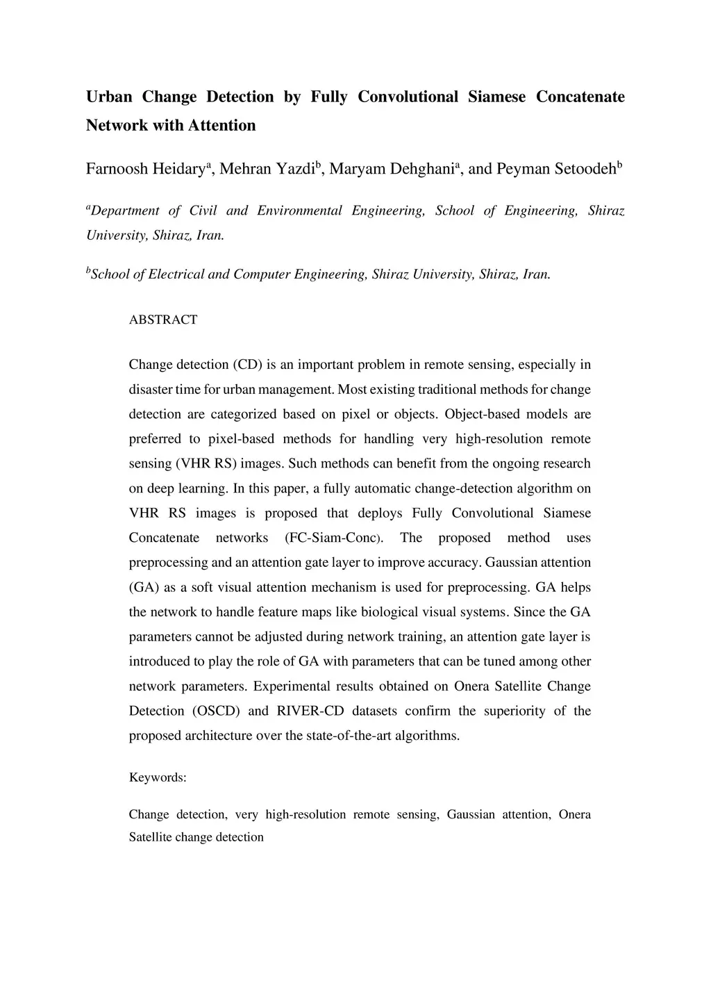 Change detection (CD) is an important problem in remote sensing, especially in disaster time for urban management. Most existing traditional methods for change detection are categorized based on pixel or objects. Object-based models are preferred to pixel-based methods for handling very high-resolution remote sensing (VHR RS) images. Such methods can benefit from the ongoing research on deep learning. In this paper, a fully automatic change-detection algorithm on VHR RS images is proposed that deploys Fully Convolutional Siamese Concatenate networks (FC-Siam-Conc). The proposed method uses preprocessing and an attention gate layer to improve accuracy. Gaussian attention (GA) as a soft visual attention mechanism is used for preprocessing. GA helps the network to handle feature maps like biological visual systems. Since the GA parameters cannot be adjusted during network training, an attention gate layer is introduced to play the role of GA with parameters that can be tuned among other network parameters. Experimental results obtained on Onera Satellite Change Detection (OSCD) and RIVER-CD datasets confirm the superiority of the proposed architecture over the state-of-the-art algorithms.