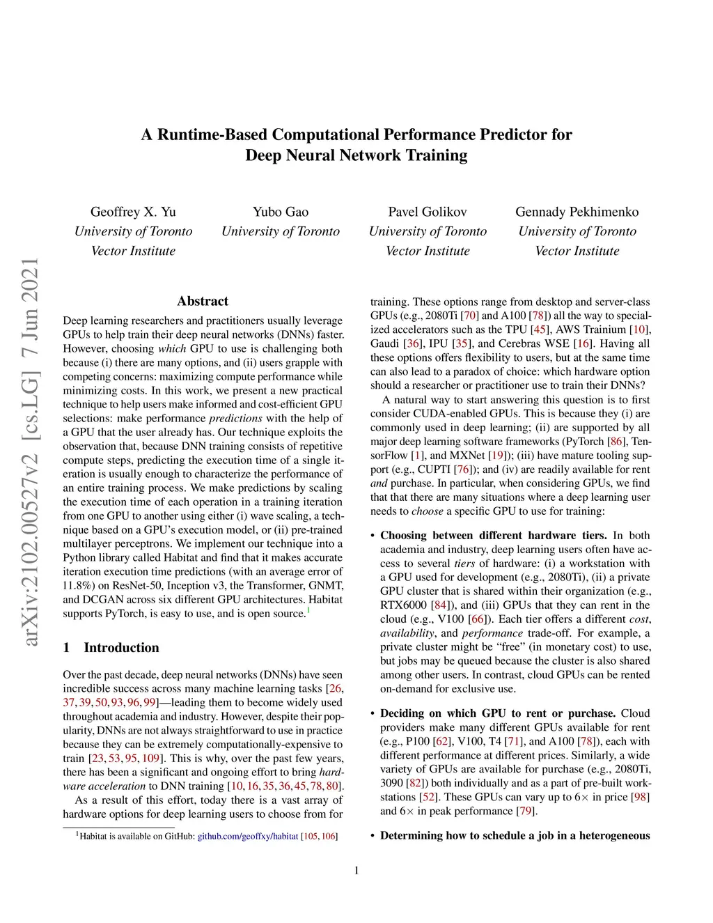 Deep learning researchers and practitioners usually leverage GPUs to help train their deep neural networks (DNNs) faster. However, choosing which GPU to use is challenging both because (i) there are many options, and (ii) users grapple with competing concerns: maximizing compute performance while minimizing costs. In this work, we present a new practical technique to help users make informed and cost-efficient GPU selections: make performance predictions with the help of a GPU that the user already has. Our technique exploits the observation that, because DNN training consists of repetitive compute steps, predicting the execution time of a single iteration is usually enough to characterize the performance of an entire training process. We make predictions by scaling the execution time of each operation in a training iteration from one GPU to another using either (i) wave scaling, a technique based on a GPU's execution model, or (ii) pre-trained multilayer perceptrons. We implement our technique into a Python library called Habitat and find that it makes accurate iteration execution time predictions (with an average error of 11.8%) on ResNet-50, Inception v3, the Transformer, GNMT, and DCGAN across six different GPU architectures. Habitat supports PyTorch, is easy to use, and is open source.