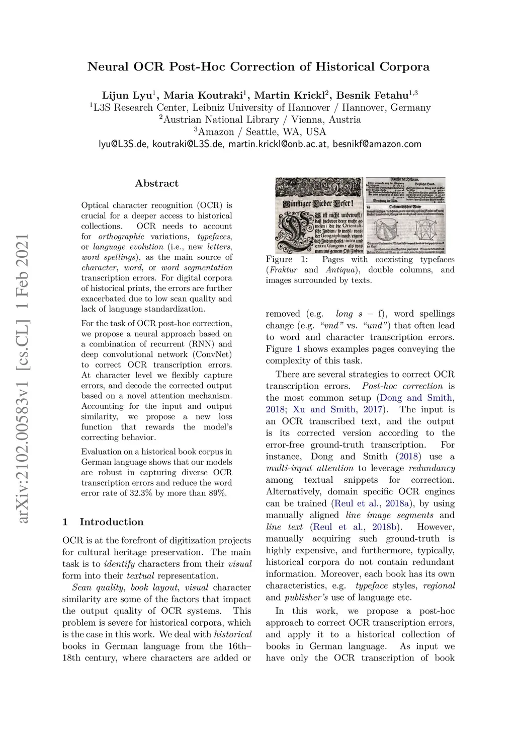 Optical character recognition (OCR) is crucial for a deeper access to historical collections. OCR needs to account for orthographic variations, typefaces, or language evolution (i.e., new letters, word spellings), as the main source of character, word, or word segmentation transcription errors. For digital corpora of historical prints, the errors are further exacerbated due to low scan quality and lack of language standardization. For the task of OCR post-hoc correction, we propose a neural approach based on a combination of recurrent (RNN) and deep convolutional network (ConvNet) to correct OCR transcription errors. At character level we flexibly capture errors, and decode the corrected output based on a novel attention mechanism. Accounting for the input and output similarity, we propose a new loss function that rewards the model's correcting behavior. Evaluation on a historical book corpus in German language shows that our models are robust in capturing diverse OCR transcription errors and reduce the word error rate of 32.3% by more than 89%.