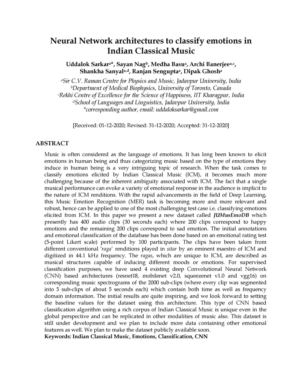 Music is often considered as the language of emotions. It has long been known to elicit emotions in human being and thus categorizing music based on the type of emotions they induce in human being is a very intriguing topic of research. When the task comes to classify emotions elicited by Indian Classical Music (ICM), it becomes much more challenging because of the inherent ambiguity associated with ICM. The fact that a single musical performance can evoke a variety of emotional response in the audience is implicit to the nature of ICM renditions. With the rapid advancements in the field of Deep Learning, this Music Emotion Recognition (MER) task is becoming more and more relevant and robust, hence can be applied to one of the most challenging test case i.e. classifying emotions elicited from ICM. In this paper we present a new dataset called JUMusEmoDB which presently has 400 audio clips (30 seconds each) where 200 clips correspond to happy emotions and the remaining 200 clips correspond to sad emotion. For supervised classification purposes, we have used 4 existing deep Convolutional Neural Network (CNN) based architectures (resnet18, mobilenet v2.0, squeezenet v1.0 and vgg16) on corresponding music spectrograms of the 2000 sub-clips (where every clip was segmented into 5 sub-clips of about 5 seconds each) which contain both time as well as frequency domain information. The initial results are quite inspiring, and we look forward to setting the baseline values for the dataset using this architecture. This type of CNN based classification algorithm using a rich corpus of Indian Classical Music is unique even in the global perspective and can be replicated in other modalities of music also. This dataset is still under development and we plan to include more data containing other emotional features as well. We plan to make the dataset publicly available soon.