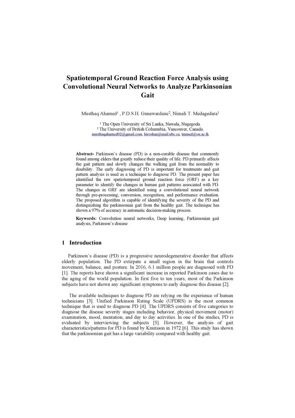 Parkinson's disease (PD) is a non-curable disease that commonly found among elders that greatly reduce their quality of life. PD primarily affects the gait pattern and slowly changes the walking gait from the normality to disability. The early diagnosing of PD is important for treatments and gait pattern analysis is used as a technique to diagnose PD. The present paper has identified the raw spatiotemporal ground reaction force (GRF) as a key parameter to identify the changes in human gait patterns associated with PD. The changes in GRF are identified using a convolutional neural network through pre-processing, conversion, recognition, and performance evaluation. The proposed algorithm is capable of identifying the severity of the PD and distinguishing the parkinsonian gait from the healthy gait. The technique has shown a 97% of accuracy in automatic decision-making process.