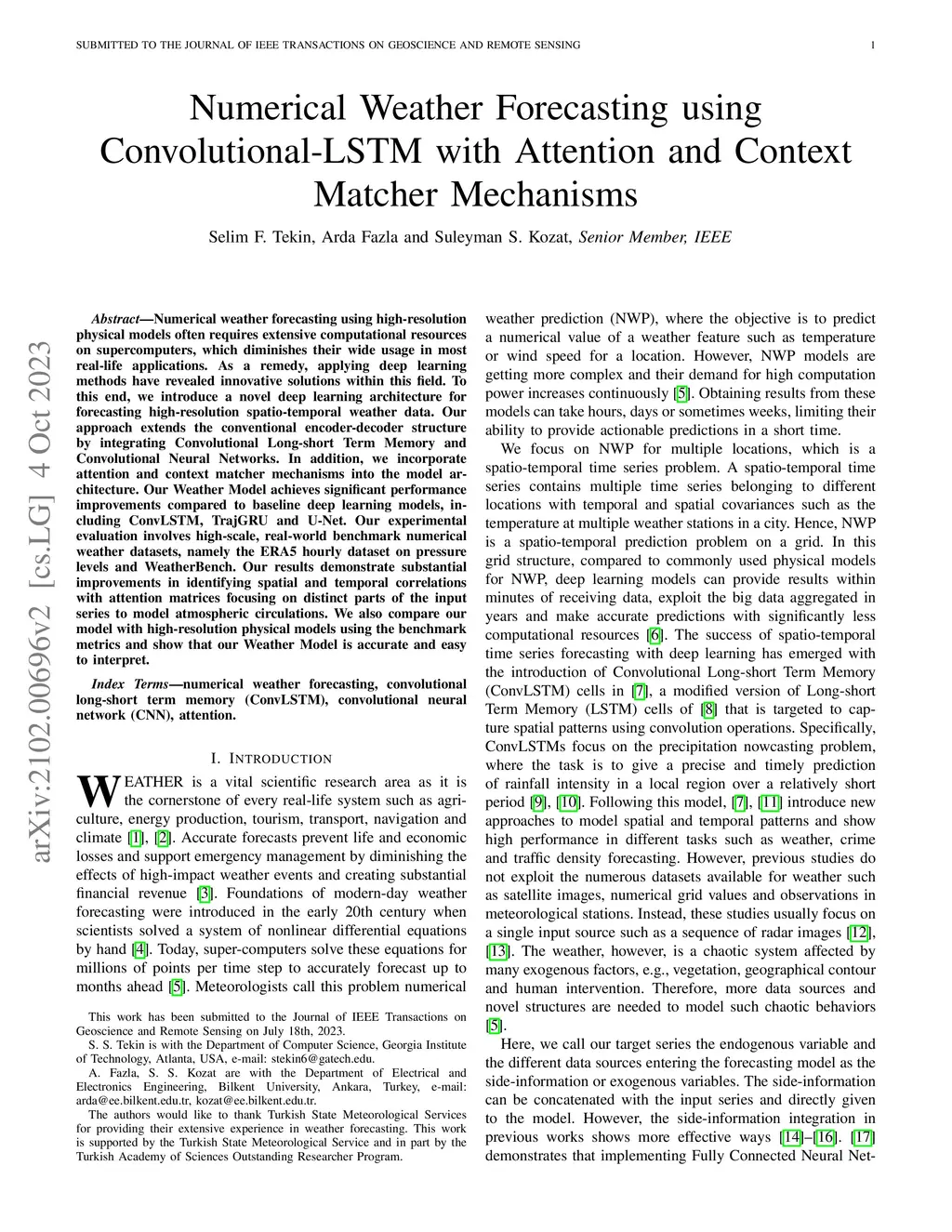 Numerical weather forecasting using high-resolution physical models often requires extensive computational resources on supercomputers, which diminishes their wide usage in most real-life applications. As a remedy, applying deep learning methods has revealed innovative solutions within this field. To this end, we introduce a novel deep learning architecture for forecasting high-resolution spatio-temporal weather data. Our approach extends the conventional encoder-decoder structure by integrating Convolutional Long-short Term Memory and Convolutional Neural Networks. In addition, we incorporate attention and context matcher mechanisms into the model architecture. Our Weather Model achieves significant performance improvements compared to baseline deep learning models, including ConvLSTM, TrajGRU, and U-Net. Our experimental evaluation involves high-scale, real-world benchmark numerical weather datasets, namely the ERA5 hourly dataset on pressure levels and WeatherBench. Our results demonstrate substantial improvements in identifying spatial and temporal correlations with attention matrices focusing on distinct parts of the input series to model atmospheric circulations. We also compare our model with high-resolution physical models using the benchmark metrics and show that our Weather Model is accurate and easy to interpret.