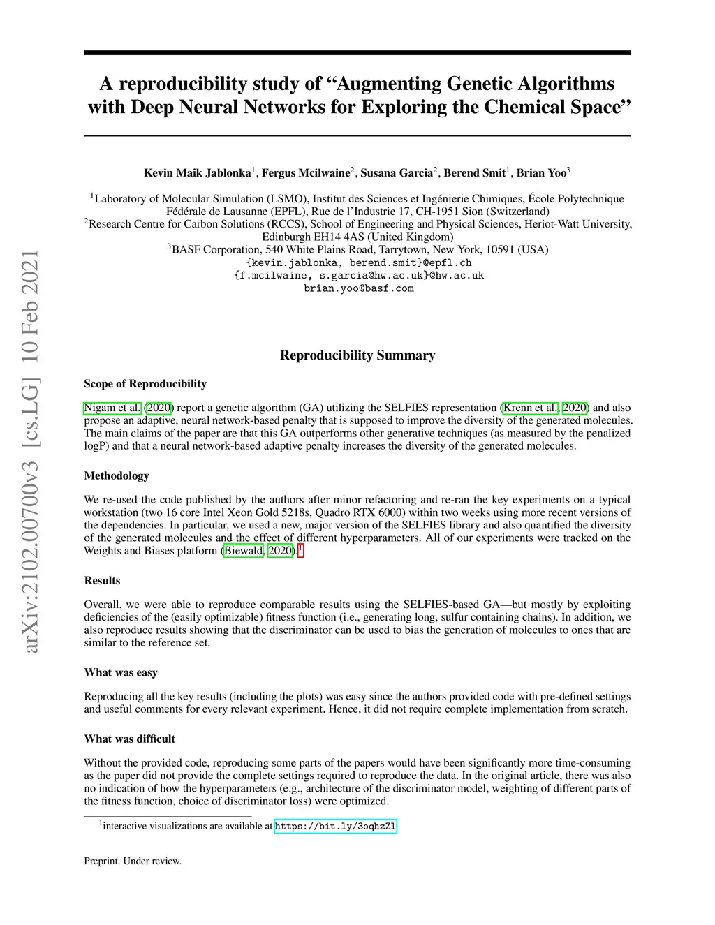 Nigam et al. reported a genetic algorithm (GA) utilizing the SELFIES representation and also propose an adaptive, neural network-based penalty that is supposed to improve the diversity of the generated molecules. The main claims of the paper are that this GA outperforms other generative techniques (as measured by the penalized logP) and that a neural network-based adaptive penalty increases the diversity of the generated molecules. In this work, we investigated the reproducibility of their claims. Overall, we were able to reproduce comparable results using the SELFIES-based GA, but mostly by exploiting deficiencies of the (easily optimizable) fitness function (i.e., generating long, sulfur containing chains). In addition, we reproduce results showing that the discriminator can be used to bias the generation of molecules to ones that are similar to the reference set. Lastly, we attempted to quantify the evolution of the diversity, understand the influence of some hyperparameters, and propose improvements to the adaptive penalty.