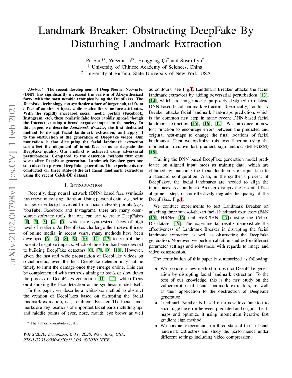 The recent development of Deep Neural Networks (DNN) has significantly increased the realism of AI-synthesized faces, with the most notable examples being the DeepFakes. The DeepFake technology can synthesize a face of target subject from a face of another subject, while retains the same face attributes. With the rapidly increased social media portals (Facebook, Instagram, etc), these realistic fake faces rapidly spread though the Internet, causing a broad negative impact to the society. In this paper, we describe Landmark Breaker, the first dedicated method to disrupt facial landmark extraction, and apply it to the obstruction of the generation of DeepFake videos.Our motivation is that disrupting the facial landmark extraction can affect the alignment of input face so as to degrade the DeepFake quality. Our method is achieved using adversarial perturbations. Compared to the detection methods that only work after DeepFake generation, Landmark Breaker goes one step ahead to prevent DeepFake generation. The experiments are conducted on three state-of-the-art facial landmark extractors using the recent Celeb-DF dataset.