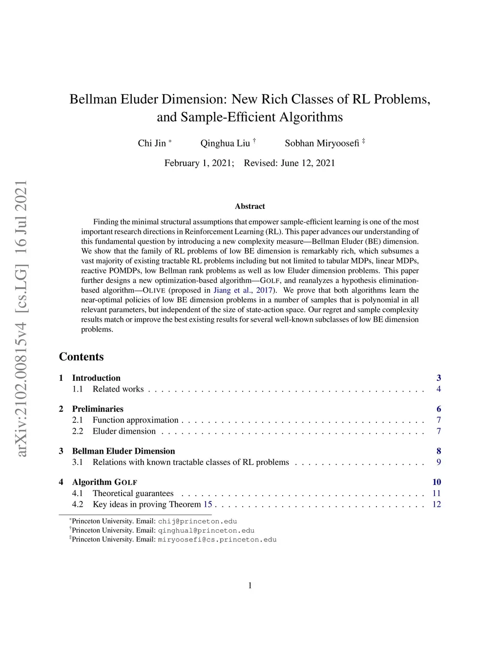 Finding the minimal structural assumptions that empower sample-efficient learning is one of the most important research directions in Reinforcement Learning (RL). This paper advances our understanding of this fundamental question by introducing a new complexity measure -- Bellman Eluder (BE) dimension. We show that the family of RL problems of low BE dimension is remarkably rich, which subsumes a vast majority of existing tractable RL problems including but not limited to tabular MDPs, linear MDPs, reactive POMDPs, low Bellman rank problems as well as low Eluder dimension problems. This paper further designs a new optimization-based algorithm -- GOLF, and reanalyzes a hypothesis elimination-based algorithm -- OLIVE (proposed in Jiang et al., 2017). We prove that both algorithms learn the near-optimal policies of low BE dimension problems in a number of samples that is polynomial in all relevant parameters, but independent of the size of state-action space. Our regret and sample complexity results match or improve the best existing results for several well-known subclasses of low BE dimension problems.